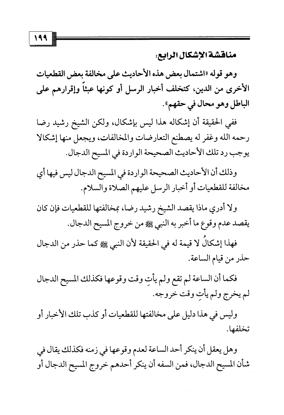 ولا أدري ماذا يقصد الشيخ رشيد رضا، بمخالفتها للقطعيات فإن كان يقصد عدم وقوع ما أخبر به النبي - صلى الله عليه وسلم - من خروج المسيح الدجال.
