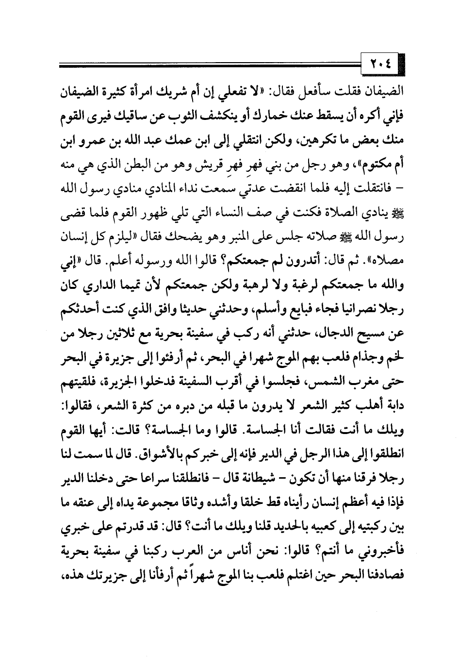 الضيفان فقلت سأفعل فقال: «لا تفعلي إن أم شريك امرأة كثيرة الضيفان فإني أكره أن يسقط عنك خمارك أو ينكشف الثوب عن ساقيك فيرى القوم منك بعض ما تكرهين، ولكن انتقلي إلى ابن عمك عبد الله بن عمرو ابن أم مكتوم»، وهو رجل من بني فهرِ فهرِ قريش وهو من البطن الذي هي منه - فانتقلت إليه فلما انقضت عدتي سمعت نداء المنادي منادي رسول الله - صلى الله عليه وسلم - ينادي الصلاة فكنت في صف النساء التي تلي ظهور القوم فلما قضى رسول الله - صلى الله عليه وسلم - صلاته جلس على المنبر وهو يضحك فقال «ليلزم كل إنسان مصلاه». ثم قال: أتدرون لم جمعتكم؟ قالوا الله ورسوله أعلم. قال «إني والله ما جمعتكم لرغبة ولا لرهبة ولكن جمعتكم لأن تميما الداري كان رجلا نصرانيا فجاء فبايع وأسلم، وحدثني حديثا وافق الذي كنت أحدثكم عن مسيح الدجال، حدثني أنه ركب في سفينة بحرية مع ثلاثين رجلا من لخم وجذام فلعب بهم الموج شهرا في البحر، ثم أرفئوا إلى جزيرة في البحر حتى مغرب الشمس، فجلسوا في أقرب السفينة فدخلوا الجزيرة، فلقيتهم دابة أهلب كثير الشعر لا يدرون ما قبله من دبره من كثرة الشعر، فقالوا: ويلك ما أنت فقالت أنا الجساسة.