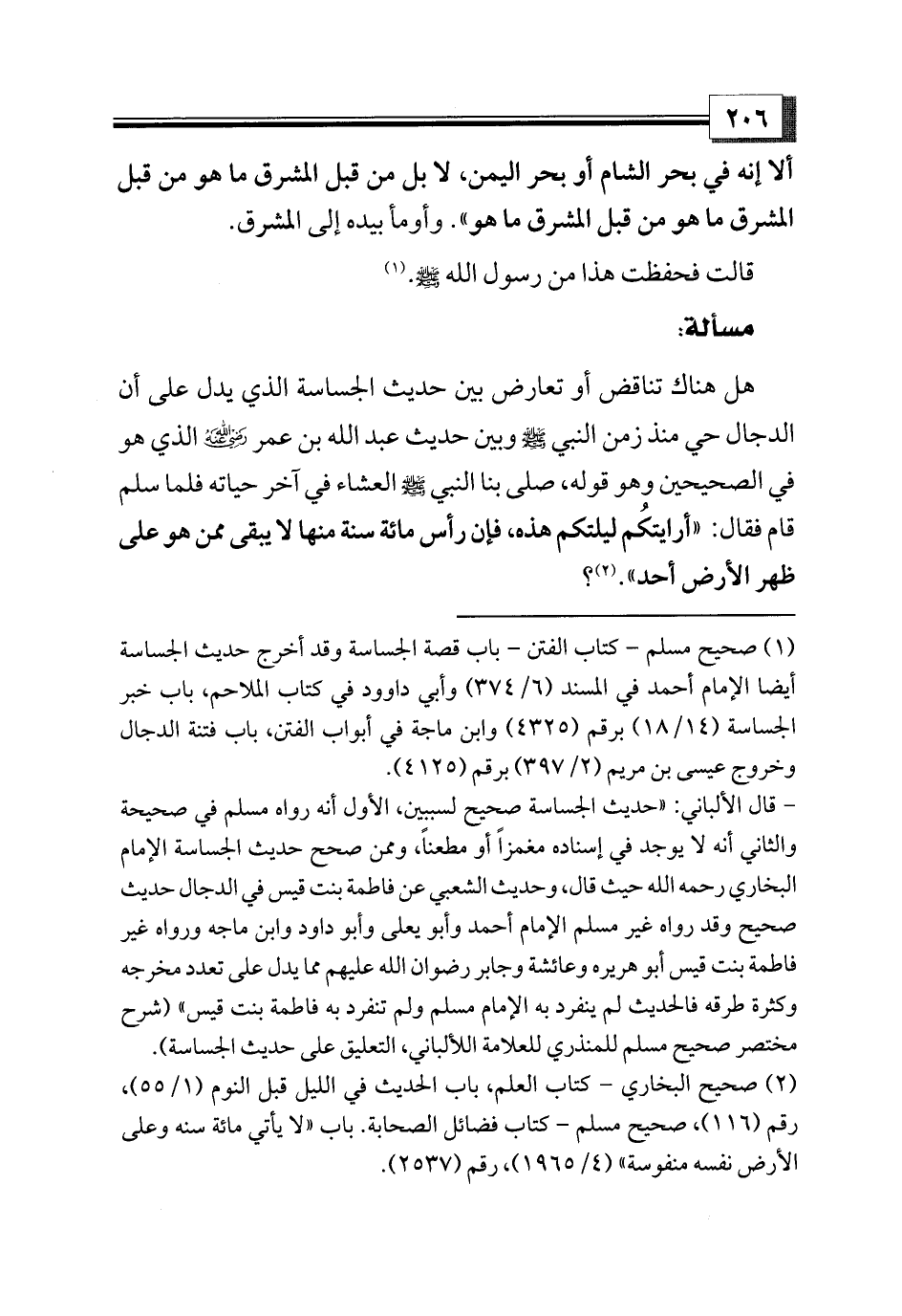 (¬1) صحيح مسلم - كتاب الفتن - باب قصة الجساسة وقد أخرج حديث الجساسة أيضا الإمام أحمد في المسند (6/ 374) وأبي داوود في كتاب الملاحم، باب خبر الجساسة (14/ 18) برقم (4325) وابن ماجة في أبواب الفتن، باب فتنة الدجال وخروج عيسى بن مريم (2/ 397) برقم (4125).