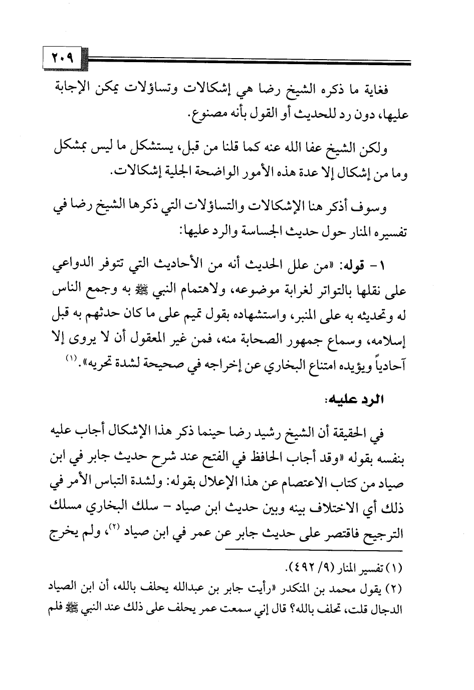 في الحقيقة أن الشيخ رشيد رضا حينما ذكر هذا الإشكال أجاب عليه بنفسه بقوله «وقد أجاب الحافظ في الفتح عند شرح حديث جابر في ابن صياد من كتاب الاعتصام عن هذا الإعلال بقوله: ولشدة التباس الأمر في ذلك أي الاختلاف بينه وبين حديث ابن صياد - سلك البخاري مسلك الترجيح فاقتصر على حديث جابر عن عمر في ابن صياد (¬2)، ولم يخرج