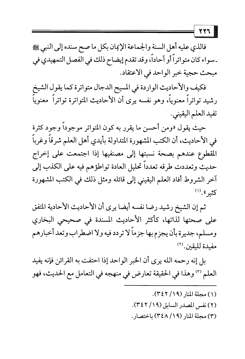 فكيف والأحاديث الواردة في المسيح الدجال متواترة كما يقول الشيخ رشيد تواتراً معنوياً، وهو نفسه يرى أن الأحاديث المتواترة تواتراً معنوياً تفيد العلم اليقيني.