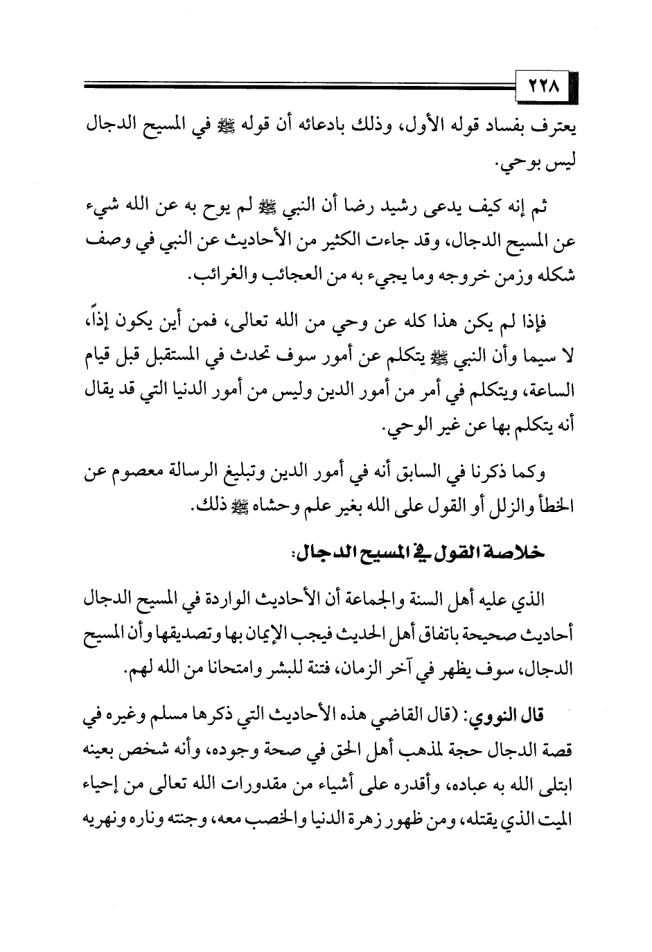 ثم إنه كيف يدعى رشيد رضا أن النبي - صلى الله عليه وسلم - لم يوح به عن الله شيء عن المسيح الدجال، وقد جاءت الكثير من الأحاديث عن النبي في وصف شكله وزمن خروجه وما يجيء به من العجائب والغرائب.