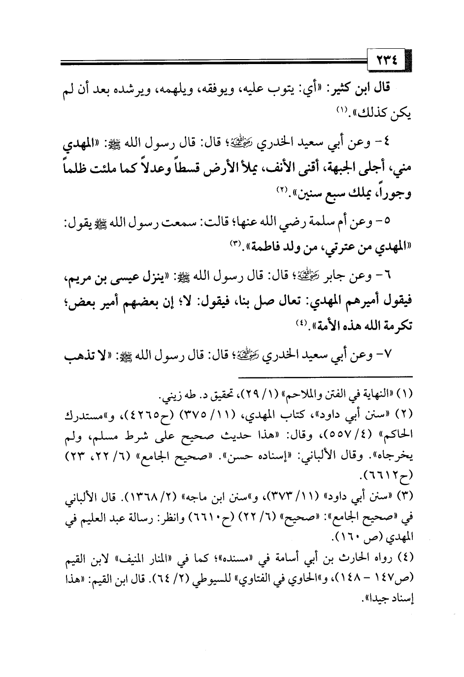 (¬3) «سنن أبي داود» (11/ 373)، و» سنن ابن ماجه» (2/ 1368). قال الألباني في «صحيح الجامع»: «صحيح» (6/ 22) (ح 6610) وانظر: رسالة عبد العليم في المهدي (ص 160).