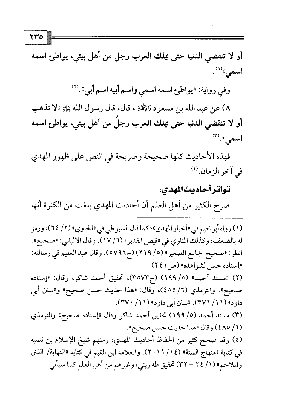 (¬4) وقد صحح كثير من الحفاظ أحاديث المهدي، ومنهم شيخ الإسلام بن تيمية في كتابة «منهاج السنة» (14/ 2011). والعلامة ابن القيم في كتابه «النهاية/ الفتن والملاحم» (1/ 24 - 32) تحقيق طه زيني، وغيرهم من أهل العلم كما سيأتي.