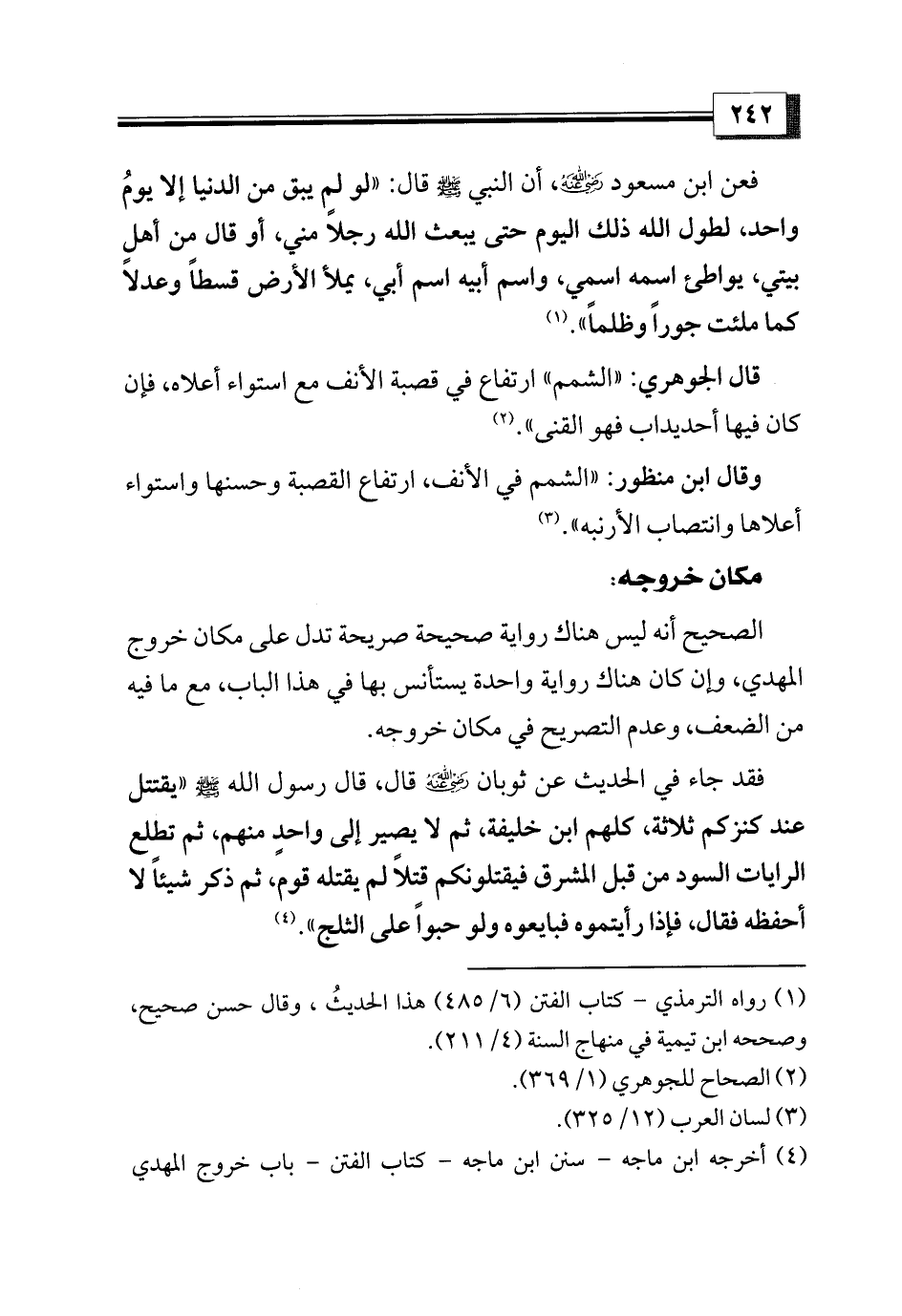 (¬4) أخرجه ابن ماجه - سنن ابن ماجه - كتاب الفتن - باب خروج المهدي (2/ 1367)، ومستدرك الحاكم (4/ 463) وقال حديثٌ صحيح على شرط الشيخين، وقال ابن كثير، هذا إسنادٌ قوي صحيح «النهاية/ الفتن والملاحم (1/ 29) تحقيق طه زيني، وضعف الحديث آخرون كأحمد والذهبي في الميزان وحكم عليه ابن الجوزي بالوضع، وضعفة الألباني في ضعيف ابن ماجه (9/ 84).
