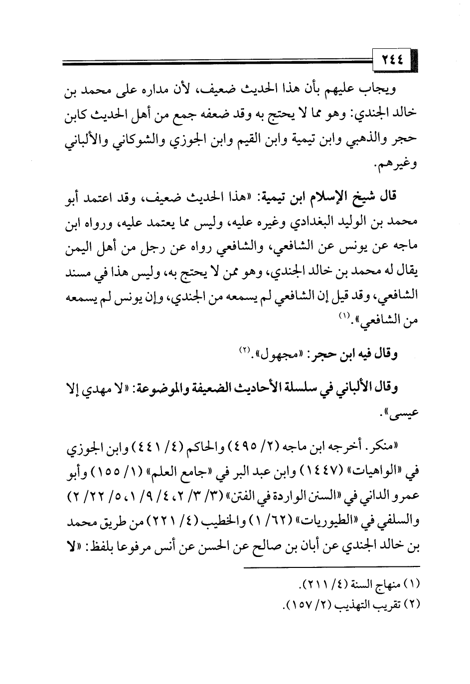 وقال الألباني في سلسلة الأحاديث الضعيفة والموضوعة: «لا مهدي إلا عيسى».