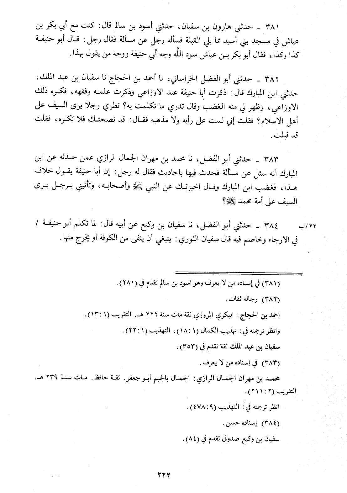 381 - حَدَّثَنِي هَارُونُ بْنُ سُفْيَانَ، حَدَّثَنِي أَسْوَدُ بْنُ سَالِمٍ، قَالَ: كُنْتُ مَعَ أَبِي بَكْرِ بْنِ عَيَّاشٍ فِي مَسْجِدِ بَنِي أُسَيْدٍ مِمَّا يَلِي الْقِبْلَةَ فَسَأَلَهُ رَجُلٌ عَنْ مَسْأَلَةٍ فَقَالَ رَجُلٌ قَالَ أَبُو حَنِيفَةَ كَذَا وَكَذَا فَقَالَ أَبُو بَكْرِ بْنُ عَيَّاشٍ «§سَوَّدَ اللَّهُ وَجْهَ أَبِي حَنِيفَةَ وَوَجْهَ مَنْ يَقُولُ بِهَذَا»