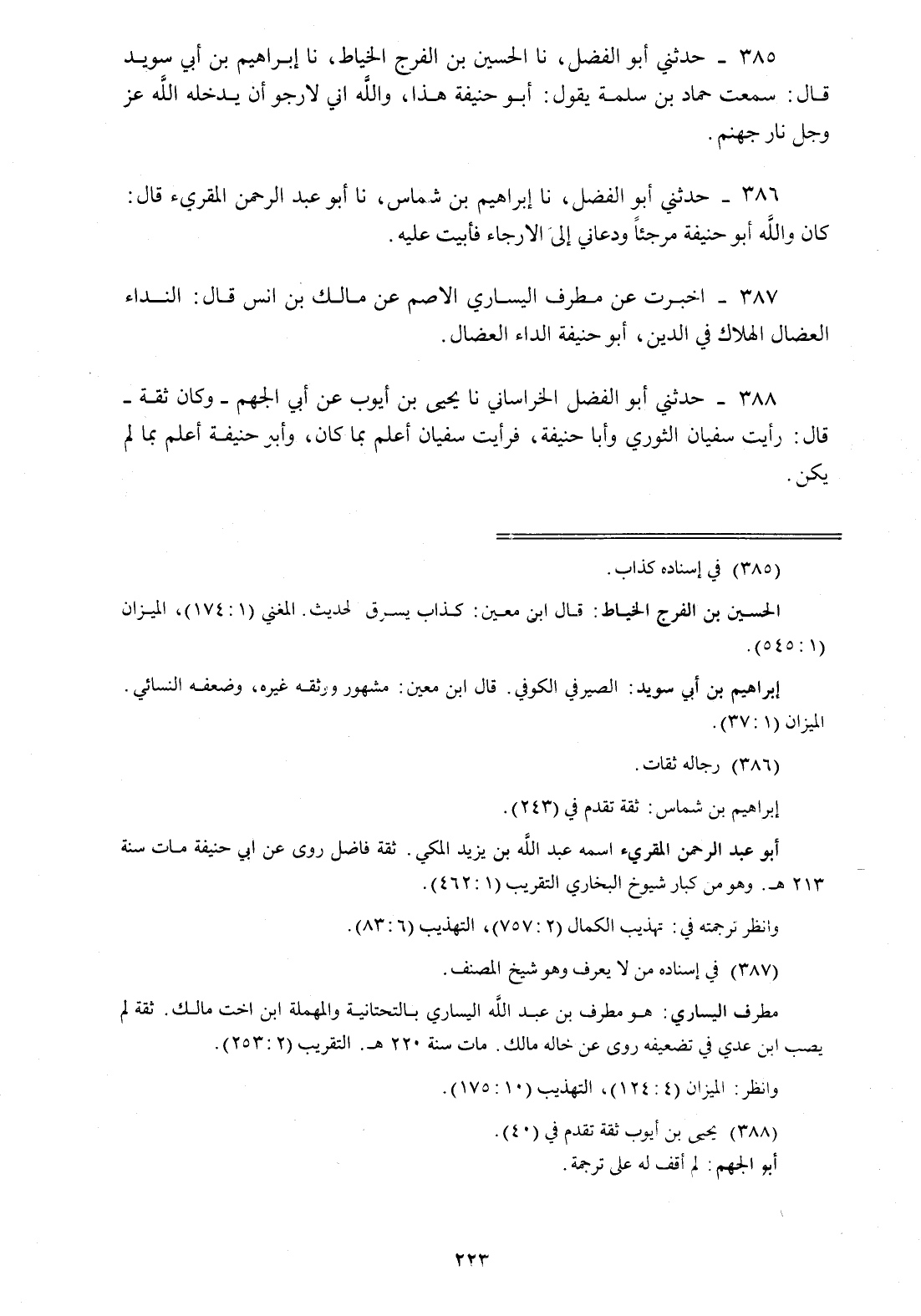 386 - حَدَّثَنِي أَبُو الْفَضْلِ، نا إِبْرَاهِيمُ بْنُ شَمَّاسٍ، نا أَبُو عَبْدِ الرَّحْمَنِ الْمُقْرِئُ، قَالَ: «§كَانَ وَاللَّهِ أَبُو حَنِيفَةَ مُرْجِئًا وَدَعَانِي إِلَى الْإِرْجَاءِ فَأَبَيْتُ عَلَيْهِ»
