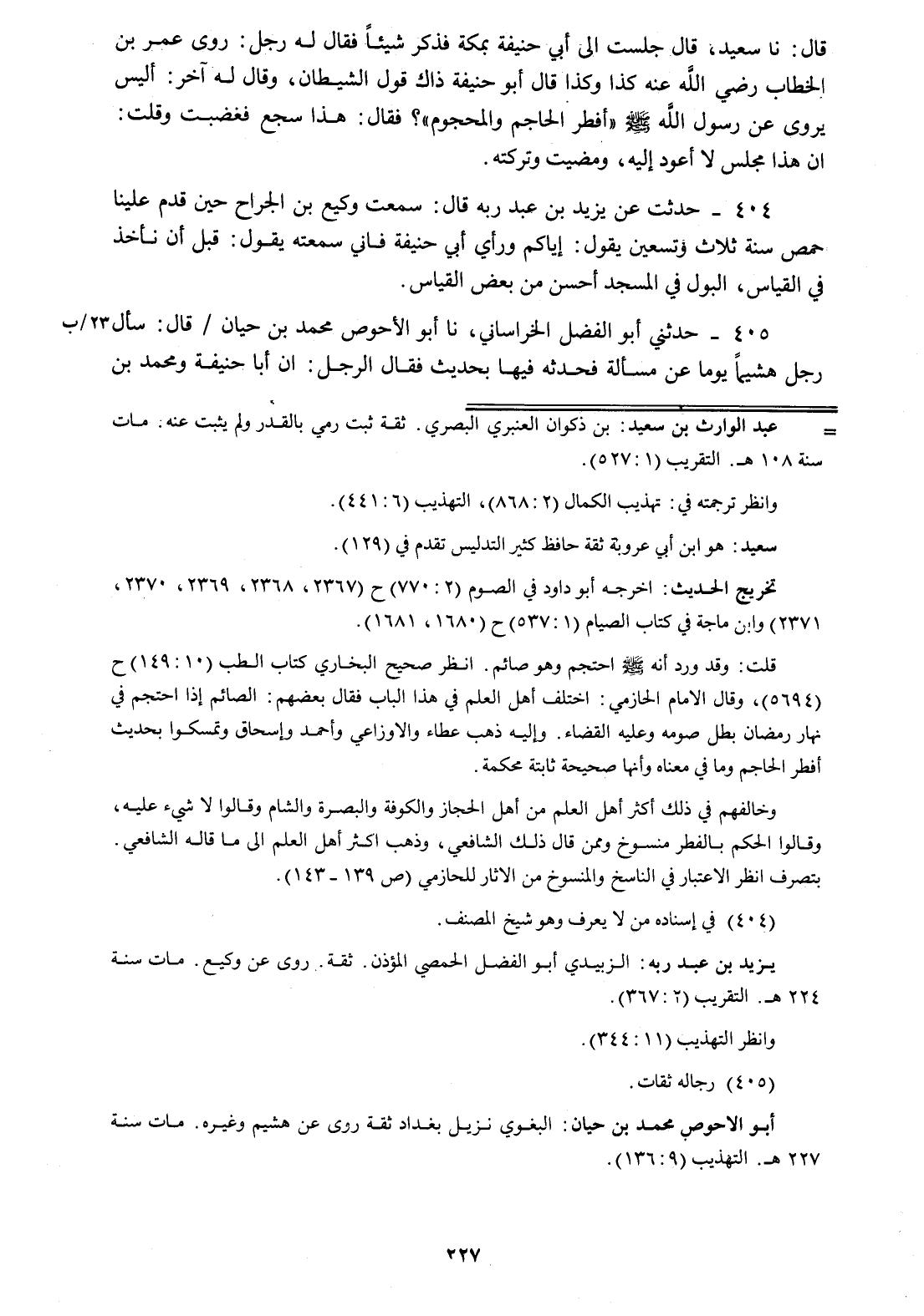 404 - حُدِّثْتُ عَنْ يَزِيدَ بْنِ عَبْدِ رَبِّهِ، قَالَ: سَمِعْتُ وَكِيعَ بْنَ الْجَرَّاحِ، حِينَ قَدِمَ عَلَيْنَا حِمْصَ سَنَةَ ثَلَاثٍ وَتِسْعِينَ يَقُولُ: " §إِيَّاكُمْ وَرَأْيَ أَبِي حَنِيفَةَ فَإِنِّي سَمِعْتُهُ يَقُولُ: قَبْلَ أَنْ نَأْخُذَ فِي الْقِيَاسِ، الْبَوْلُ فِي الْمَسْجِدِ أَحْسَنُ مِنْ بَعْضِ الْقِيَاسِ "