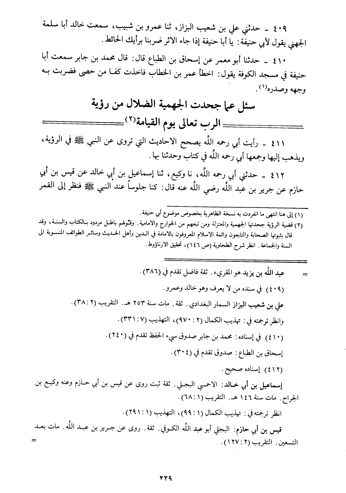 411 - رَأَيْتُ أَبِيَ رَحِمَهُ اللَّهُ يُصَحِّحُ الْأَحَادِيثَ الَّتِي تُرْوَى عَنِ النَّبِيِّ صَلَّى اللهُ عَلَيْهِ وَسَلَّمَ فِي الرُّؤْيَةِ وَيَذْهَبُ إِلَيْهَا وَجَمَعَهَا أَبِي رَحِمَهُ اللَّهُ فِي كِتَابٍ وَحَدَّثَنَا بِهَا»