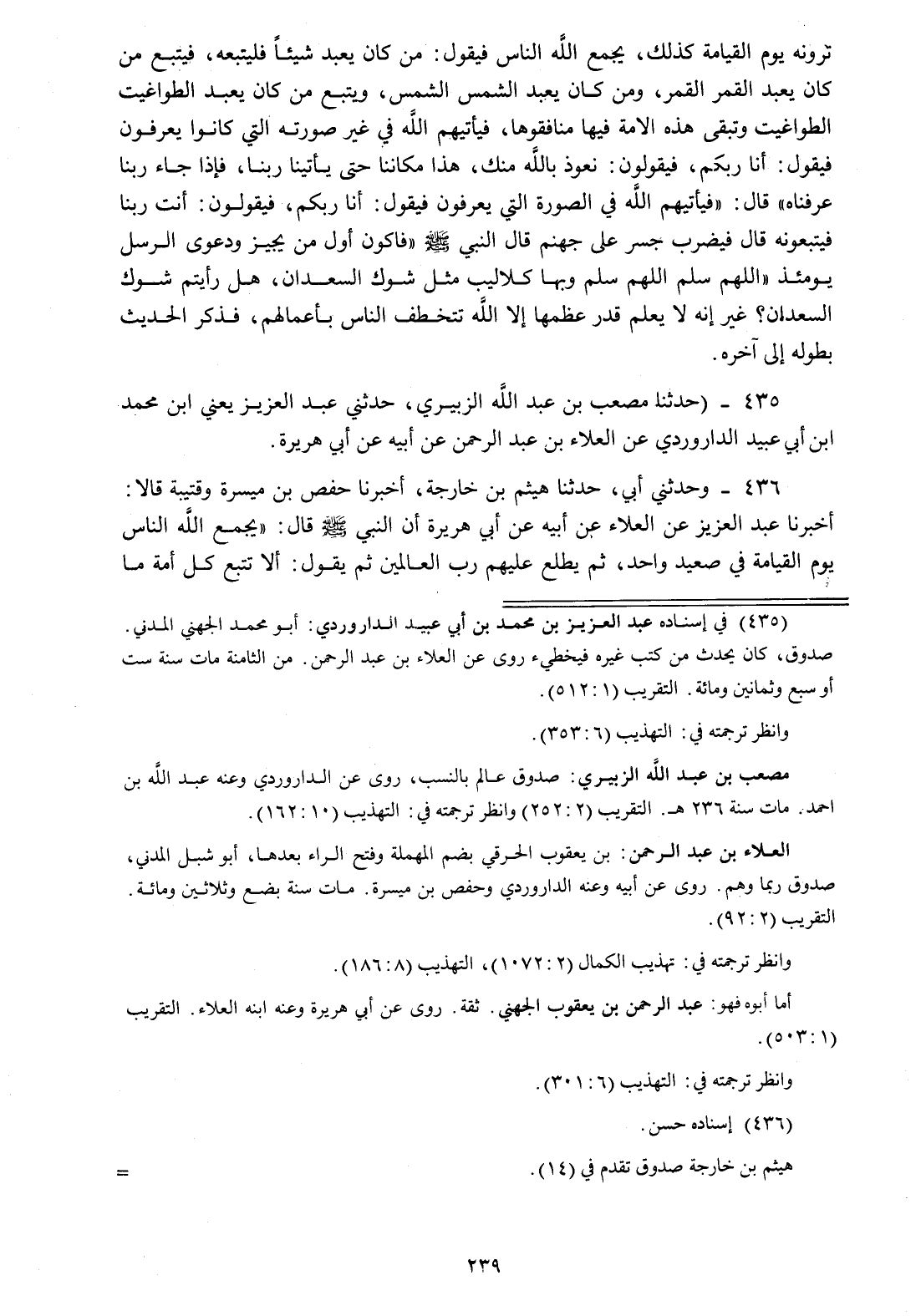 436 - وَحَدَّثَنِي أَبِي، حَدَّثَنَا هَيْثَمُ بْنُ خَارِجَةَ، أَخْبَرَنَا حَفْصُ بْنُ مَيْسَرَةَ، وَقُتَيْبَةُ، قَالَا: أَخْبَرَنَا عَبْدُ الْعَزِيزِ، عَنِ الْعَلَاءِ، عَنْ أَبِيهِ، عَنْ أَبِي هُرَيْرَةَ، أَنَّ النَّبِيَّ صَلَّى اللهُ عَلَيْهِ وَسَلَّمَ قَالَ: §يَجْمَعُ اللَّهُ النَّاسَ يَوْمَ الْقِيَامَةِ فِي صَعِيدٍ وَاحِدٍ، ثُمَّ يَطْلُعُ عَلَيْهِمْ رَبُّ الْعَالَمِينَ ثُمَّ يَقُولُ: «أَلَا تَتْبَعُ كُلُّ أُمَّةٍ مَا -[240]- كَانُوا يَعْبُدُونَ» فَذَكَرَ الْحَدِيثَ فَقَالُوا: وَهَلْ نَرَاهُ يَا رَسُولَ اللَّهِ؟ قَالَ: «وَهَلْ تُضَارُّونَ فِي رُؤْيَةِ الْقَمَرِ لَيْلَةَ الْبَدْرِ؟» قَالُوا: لَا، قَالَ: " فَإِنَّكُمْ لَا تُضَارُّونَ رُؤْيَتِهِ تِلْكَ السَّاعَةِ ثُمَّ يَتَوَارَى ثُمَّ يَطْلُعُ فَيُعَرِّفُهُمْ نَفْسَهُ ثُمَّ يَقُولُ: «أَنَا رَبُّكُمُ اتَّبِعُونِي» فَيَقُومُ الْمُسْلِمُونَ وَيُوضَعُ الصِّرَاطُ فَهُمْ يَمُرُّونَ عَلَيْهِ مِثْلَ جِيَادِ الْخَيْلِ وَالرِّكَابِ وَقَوْلُهُمْ عَلَيْهِ سَلِّمْ سَلِّمْ فَذَكَرَ الْحَدِيثَ بِطُولِهِ إِلَى آخِرِهِ