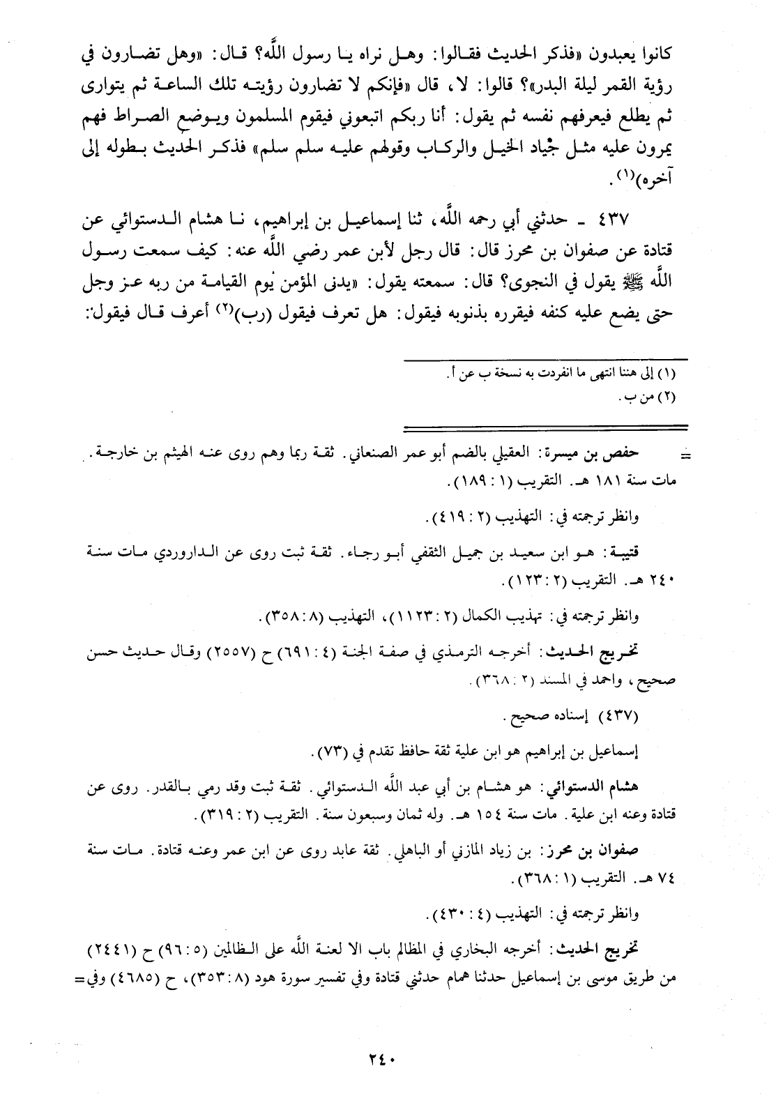 437 - حَدَّثَنِي أَبِي رَحِمَهُ اللَّهُ، ثنا إِسْمَاعِيلُ بْنُ إِبْرَاهِيمَ، نا هِشَامُ الدَّسْتُوَائِيُّ، عَنْ قَتَادَةَ، عَنْ صَفْوَانَ بْنِ مُحْرِزٍ، قَالَ: قَالَ رَجُلٌ لِابْنِ عُمَرَ رَضِيَ اللَّهُ عَنْهُ كَيْفَ سَمِعْتَ رَسُولَ اللَّهِ صَلَّى اللهُ عَلَيْهِ وَسَلَّمَ يَقُولُ فِي النَّجْوَى؟ قَالَ: سَمِعْتُهُ يَقُولُ §يُدْنَى الْمُؤْمِنُ يَوْمَ الْقِيَامَةِ مِنْ رَبِّهِ عَزَّ وَجَلَّ حَتَّى يَضَعَ عَلَيْهِ كَنَفَهُ فَيُقَرِّرَهُ بِذُنُوبِهِ فَيَقُولُ: هَلْ تَعْرِفُ؟ فَيَقُولُ: رَبِّ أَعْرِفُ، قَالَ: فَيَقُولُ -[241]-: إِنِّي سَتَرْتُهَا عَلَيْكَ فِي الدُّنْيَا وَإِنِّي أَغْفِرُهَا لَكَ الْيَوْمَ، فَيُعْطَى صَحِيفَةَ حَسَنَاتِهِ، وَأَمَّا الْكَافِرُونَ وَالْمُنَافِقُونَ فَيُنَادَى بِهِمْ عَلَى رُءُوسِ الْأَشْهَادِ {هَؤُلَاءِ الَّذِينَ كَذَبُوا عَلَى رَبِّهِمْ} [هود: 18] "