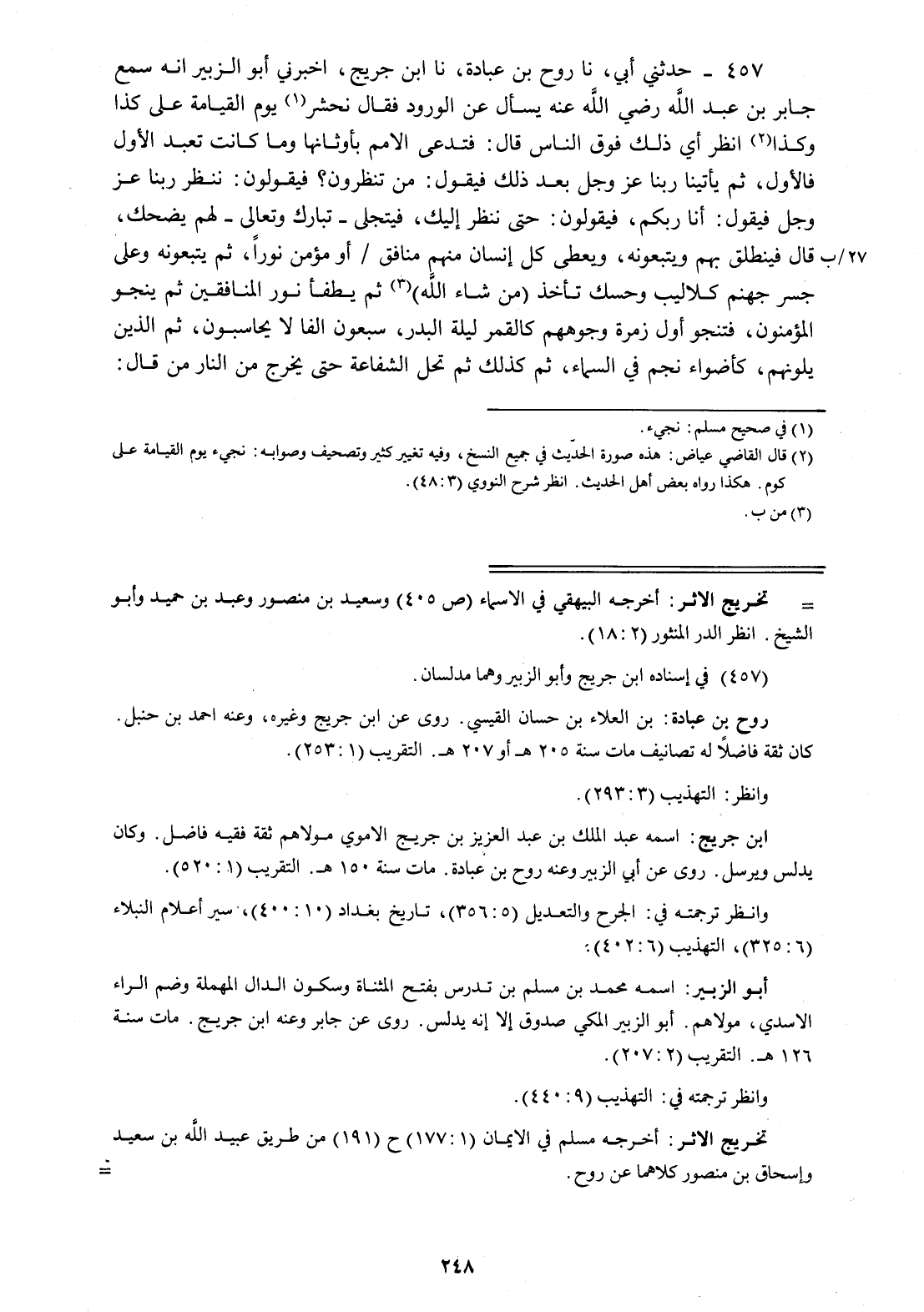 457 - حَدَّثَنِي أَبِي، نا رَوْحُ بْنُ عُبَادَةَ، نا ابْنُ جُرَيْجٍ، أَخْبَرَنِي أَبُو الزُّبَيْرِ، أَنَّهُ سَمِعَ جَابِرَ بْنَ عَبْدِ اللَّهٍ رَضِيَ اللَّهُ عَنْهُ §يُسْأَلُ عَنِ الْوُرُودِ، فَقَالَ: " نُحْشَرُ يَوْمَ الْقِيَامَةِ عَلَى كَذَا وَكَذَا انْظُرْ أَيُّ ذَلِكَ فَوْقَ النَّاسِ، قَالَ: فَتُدْعَى الْأُمَمُ بِأَوْثَانِهَا وَمَا كَانَتْ تَعْبُدُ الْأَوَّلَ فَالْأَوَّلَ، ثُمَّ يَأْتِينَا رَبُّنَا عَزَّ وَجَلَّ بَعْدَ ذَلِكَ فَيَقُولُ: مَنْ تَنْظُرُونَ؟ فَيَقُولُونَ: نَنْظُرُ رَبَّنَا عَزَّ وَجَلَّ، فَيَقُولُ: أَنَا رَبُّكُمْ، فَيَقُولُونَ: حَتَّى نَنْظُرَ إِلَيْكَ فَيَتَجَلَّى تَبَارَكَ وَتَعَالَى لَهُمْ يَضْحَكُ، قَالَ: فَيَنْطَلِقُ بِهِمْ وَيَتَّبِعُونَهُ وَيُعْطِي كُلَّ إِنْسَانٍ مِنْهُمْ مُنَافِقٌ أَوْ مُؤْمِنٌ نُورًا ثُمَّ يَتَّبِعُونَهُ وَعَلَى جِسْرِ جَهَنَّمَ كَلَالِيبُ وَحَسَكٌ تَأْخُذُ مَنْ شَاءَ اللَّهُ، ثُمَّ يُطْفَأُ نُورُ الْمُنَافِقِينَ ثُمَّ يَنْجُو الْمُؤْمِنُونَ فَتَنْجُو أَوَّلُ زُمْرَةٍ وُجُوهُهُمْ كَالْقَمَرِ لَيْلَةَ الْبَدْرِ سَبْعُونَ أَلْفًا لَا يُحَاسَبُونَ ثُمَّ الَّذِينَ يَلُونَهُمْ كَأَضْوَاءِ نَجْمٍ فِي السَّمَاءِ، ثُمَّ كَذَلِكَ ثُمَّ تَحِلُّ الشَّفَاعَةُ حَتَّى يَخْرُجَ مِنَ النَّارِ، مَنْ قَالَ -[249]-: لَا إِلَهَ إِلَّا اللَّهُ وَكَانَ فِي قَلْبِهِ مِنَ الْخَيْرِ مَا يَزِنُ شَعِيرَةً، فَيُجْعَلُونَ بِفِنَاءِ الْجَنَّةِ وَيُجْعَلُ أَهْلُ الْجَنَّةِ يَرُشُّونَ عَلَيْهِمُ الْمَاءَ حَتَّى يَنْبُتُوا نَبَاتَ الشَّيْءِ فِي السَّيْلِ، ثُمَّ يَسْأَلُ حَتَّى تُجْعَلَ لَهُ الدُّنْيَا وَعَشَرَةُ أَمْثَالِهَا مَعَهَا "