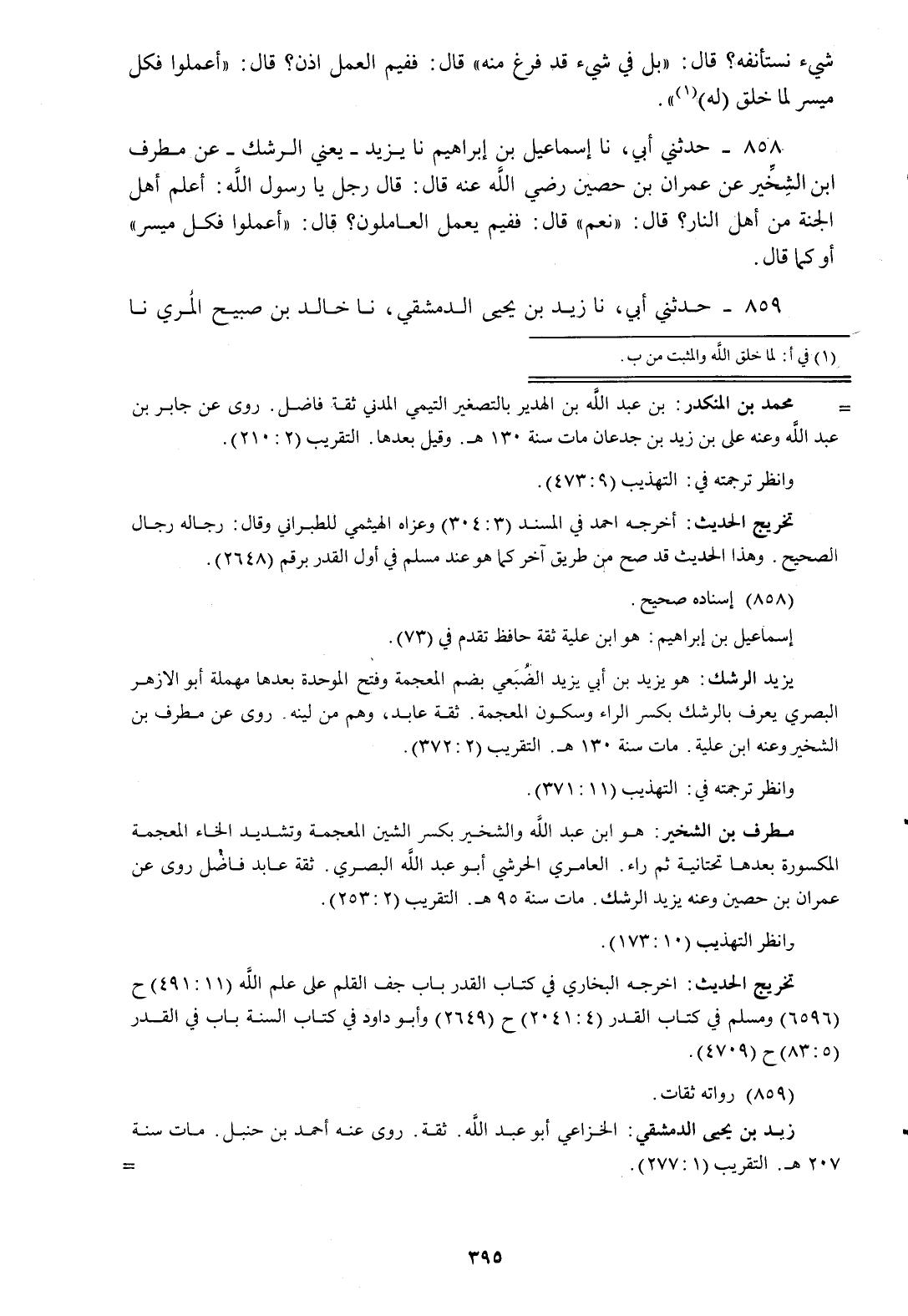 858 - حَدَّثَنِي أَبِي، نا إِسْمَاعِيلُ بْنُ إِبْرَاهِيمَ، نا يَزِيدُ يَعْنِي الرَّشْكَ، عَنْ مُطَرِّفِ بْنِ الشِّخِّيرِ، عَنْ عِمْرَانَ بْنِ حُصَيْنٍ رَضِيَ اللَّهُ عَنْهُ قَالَ: قَالَ رَجُلٌ: يَا رَسُولَ اللَّهِ، §أَعُلِمَ أَهْلُ الْجَنَّةِ مِنْ أَهْلِ النَّارِ؟ قَالَ: «نَعَمْ» قَالَ: فَفِيمَ يَعْمَلُ الْعَامِلُونَ؟ قَالَ: «اعْمَلُوا فَكُلٌّ مُيَسَّرٌ» أَوْ كَمَا قَالَ