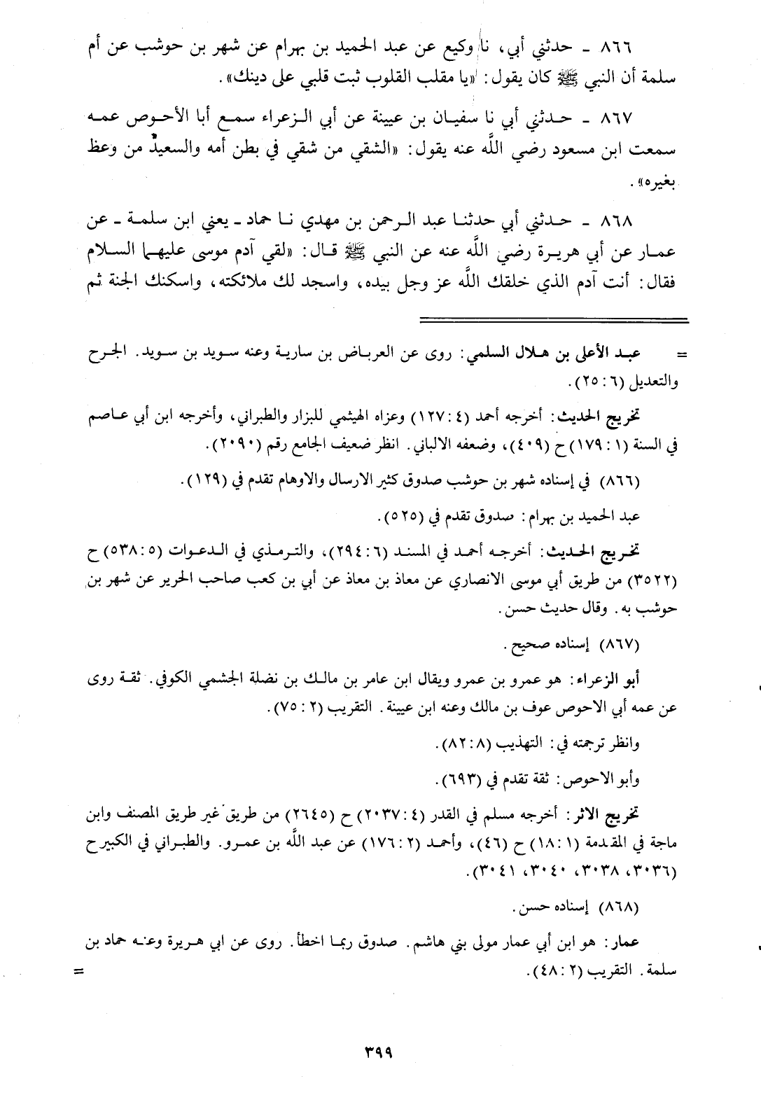 866 - حَدَّثَنِي أَبِي، نا وَكِيعٌ، عَنْ عَبْدِ الْحَمِيدِ بْنِ بَهْرَامَ، عَنْ شَهْرِ بْنِ حَوْشَبٍ، عَنْ أُمِّ سَلَمَةَ، أَنَّ النَّبِيَّ صَلَّى اللهُ عَلَيْهِ وَسَلَّمَ كَانَ يَقُولُ: «§يَا مُقَلِّبَ الْقُلُوبِ ثَبِّتْ قَلْبِي عَلَى دِينِكَ»