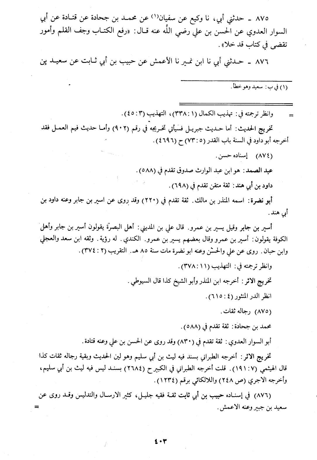 875 - حَدَّثَنِي أَبِي، نا وَكِيعٌ، عَنْ سُفْيَانَ، عَنْ مُحَمَّدِ بْنِ جُحَادَةَ، عَنْ قَتَادَةَ، عَنْ أَبِي السَّوَّارِ الْعَدَوِيِّ، عَنِ الْحَسَنِ بْنِ عَلِيٍّ رَضِيَ اللَّهُ عَنْهُ قَالَ: «§رُفِعَ الْكِتَابُ وَجَفَّ الْقَلَمُ، وَأُمُورٌ تُقْضَى فِي كِتَابٍ قَدْ خَلَا»