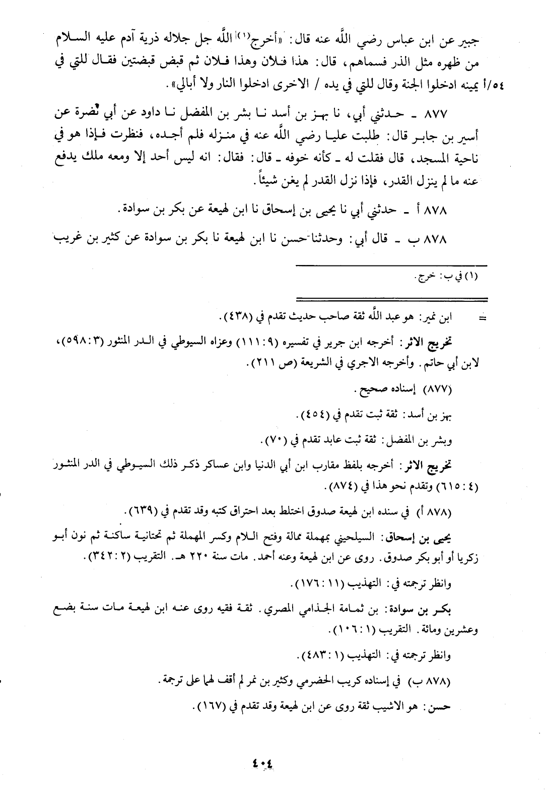حَدَّثَنِي أَبِي، نا يَحْيَى بْنُ إِسْحَاقَ، نا ابْنُ لَهِيعَةَ، عَنْ بَكْرِ بْنِ سَوَادَةَ. قَالَ أَبِي: وَحَدَّثَنَا حَسَنٌ، نا ابْنُ لَهِيعَةَ، نا بَكْرُ بْنُ سَوَادَةَ، عَنْ كَثِيرِ بْنِ غَرِيبٍ -[405]- الْخَوْلَانِيِّ، عَنْ كُرَيْبٍ الْحَضْرَمِيِّ، عَنْ أَبِي هُرَيْرَةَ رَضِيَ اللَّهُ عَنْهُ قَالَ: «§مَضَتِ الْكُتُبُ وَجَفَّتِ الْأَقْلَامُ» قَالَ حَسَنٌ فِي حَدِيثِهِ: فَشَقِيُّ أَوْ سَعِيدٌ، فَرِيقٌ فِي الْجَنَّةِ وَفَرِيقٌ فِي السَّعِيرِ "
