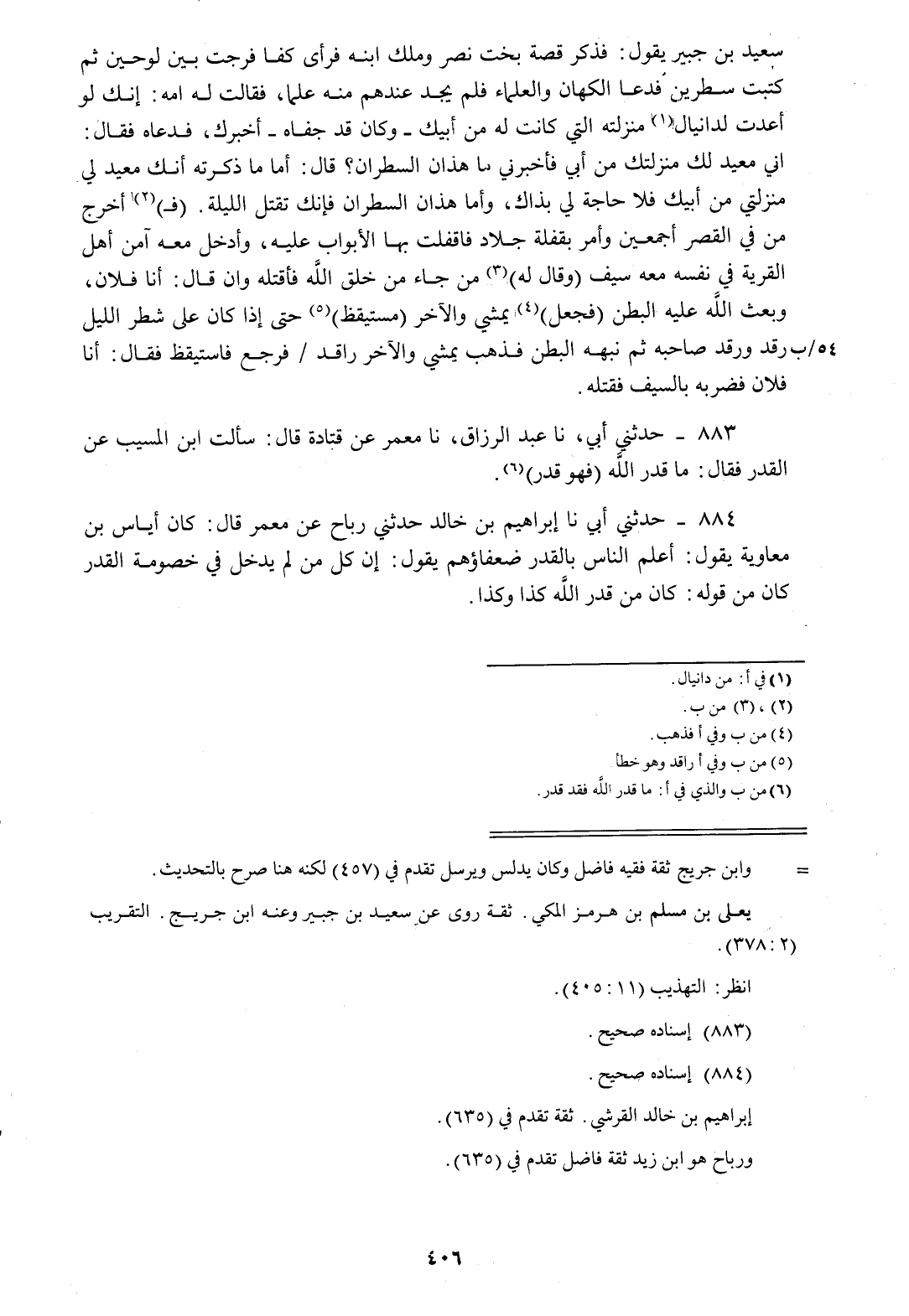 883 - حَدَّثَنِي أَبِي، نا عَبْدُ الرَّزَّاقِ، نا مَعْمَرٌ، عَنْ قَتَادَةَ، قَالَ: سَأَلْتُ ابْنَ الْمُسَيِّبِ عَنِ الْقَدَرِ، فَقَالَ: «§مَا قَدَّرَ اللَّهُ فَهُوَ قَدَرٌ»