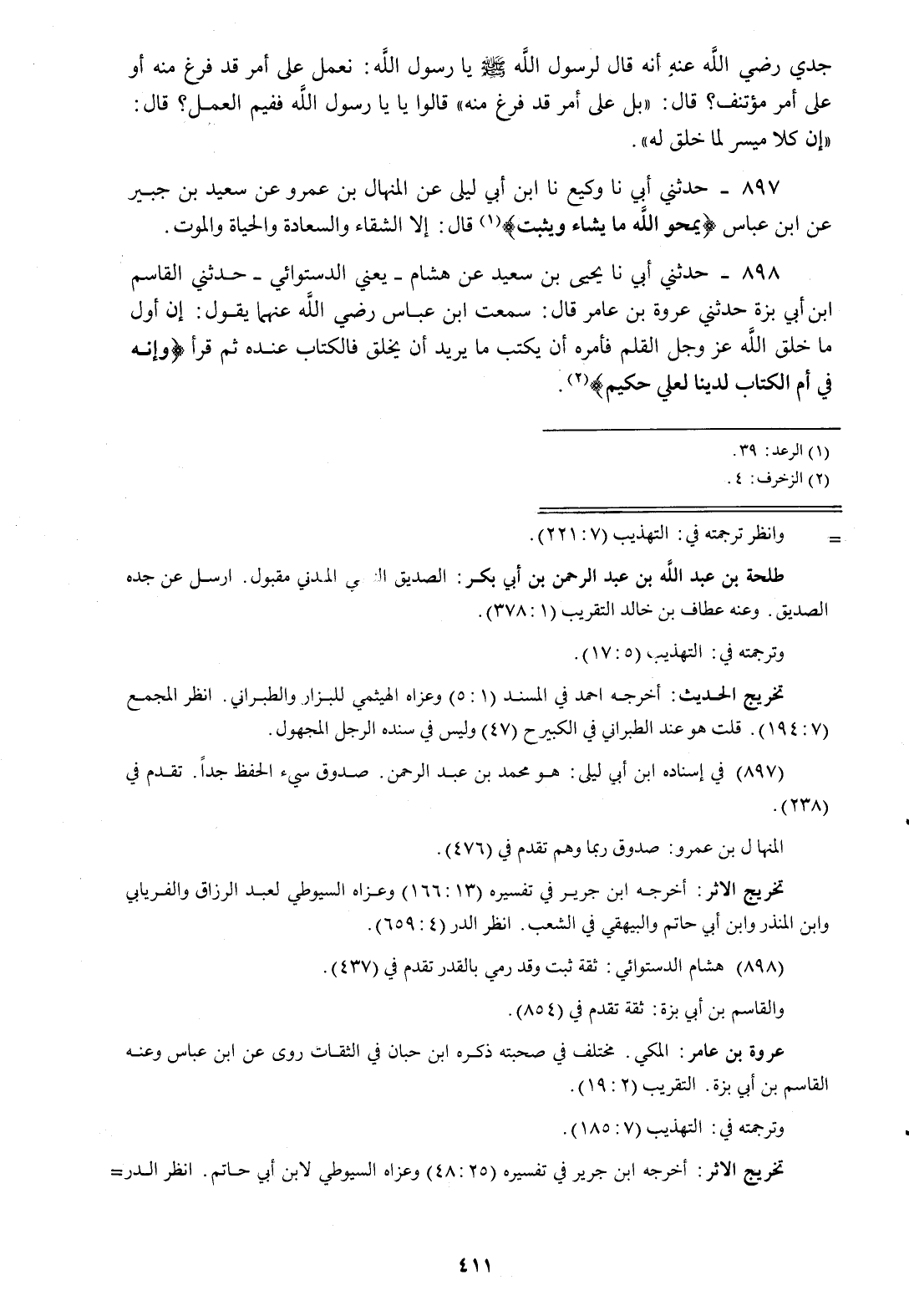 897 - حَدَّثَنِي أَبِي، نا وَكِيعٌ، نا ابْنُ أَبِي لَيْلَى، عَنِ الْمِنْهَالِ بْنِ عَمْرٍو، عَنْ سَعِيدِ بْنِ جُبَيْرٍ، عَنِ ابْنِ عَبَّاسٍ، §يَمْحُو اللَّهُ مَا يَشَاءُ وَيُثْبِتُ قَالَ: «إِلَّا الشَّقَاءَ وَالسَّعَادَةَ وَالْحَيَاةَ وَالْمَوْتَ»