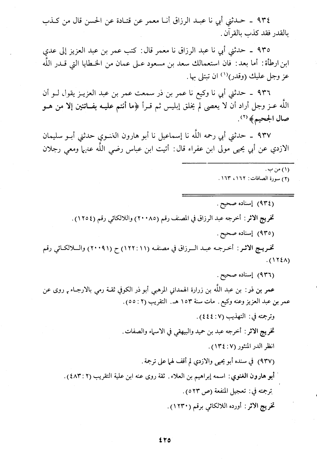 934 - حَدَّثَنِي أَبِي، نا عَبْدُ الرَّزَّاقِ، أَنَا مَعْمَرٌ، عَنْ قَتَادَةَ، عَنِ الْحَسَنِ، قَالَ: «§مَنْ كَذَّبَ بِالْقَدَرِ فَقَدْ كَذَّبَ بِالْقُرْآنِ»