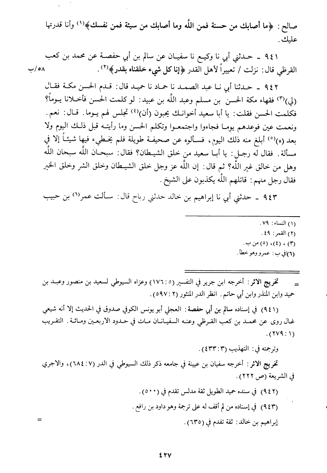 941 - حَدَّثَنِي أَبِي، نا وَكِيعٌ، نا سُفْيَانُ، عَنْ سَالِمِ بْنِ أَبِي حَفْصَةَ، عَنْ مُحَمَّدِ بْنِ كَعْبٍ الْقُرَظِيِّ، قَالَ: «§نَزَلَتْ تَعْيِيرًا لِأَهْلِ الْقَدَرِ» {إِنَّا كُلَّ شَيْءٍ خَلَقْنَاهُ بِقَدَرٍ} [القمر: 49]