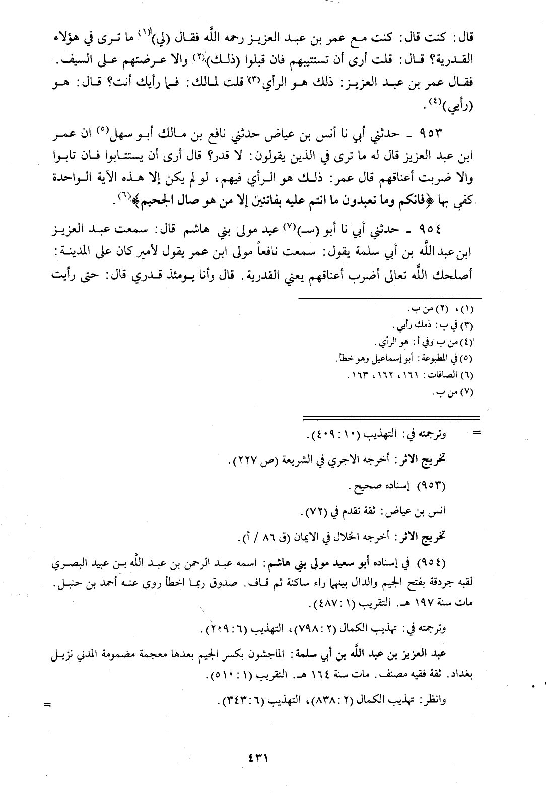 953 - حَدَّثَنِي أَبِي، نا أَنَسُ بْنُ عِيَاضٍ، حَدَّثَنِي نَافِعُ بْنُ مَالِكٍ أَبُو سَهْلٍ، أَنَّ عُمَرَ بْنَ عَبْدِ الْعَزِيزِ، قَالَ لَهُ: «§مَا تَرَى فِي الَّذِينَ يَقُولُونَ لَا قَدَرَ؟» قَالَ: أَرَى أَنْ يُسْتَتَابُوا، فَإِنْ تَابُوا وَإِلَّا ضَرَبْتَ أَعْنَاقَهُمْ، قَالَ عُمَرُ: ذَلِكَ هُوَ الرَّأْيُ فِيهِمْ، لَوْ لَمْ يَكُنْ إِلَّا هَذِهِ الْآيَةُ الْوَاحِدَةُ كَفَى بِهَا {فَإِنَّكُمْ وَمَا تَعْبُدُونَ مَا أَنْتُمْ عَلَيْهِ بِفَاتِنِينَ إِلَّا مَنْ هُوَ صَالِ الْجَحِيمِ} [الصافات: 162]