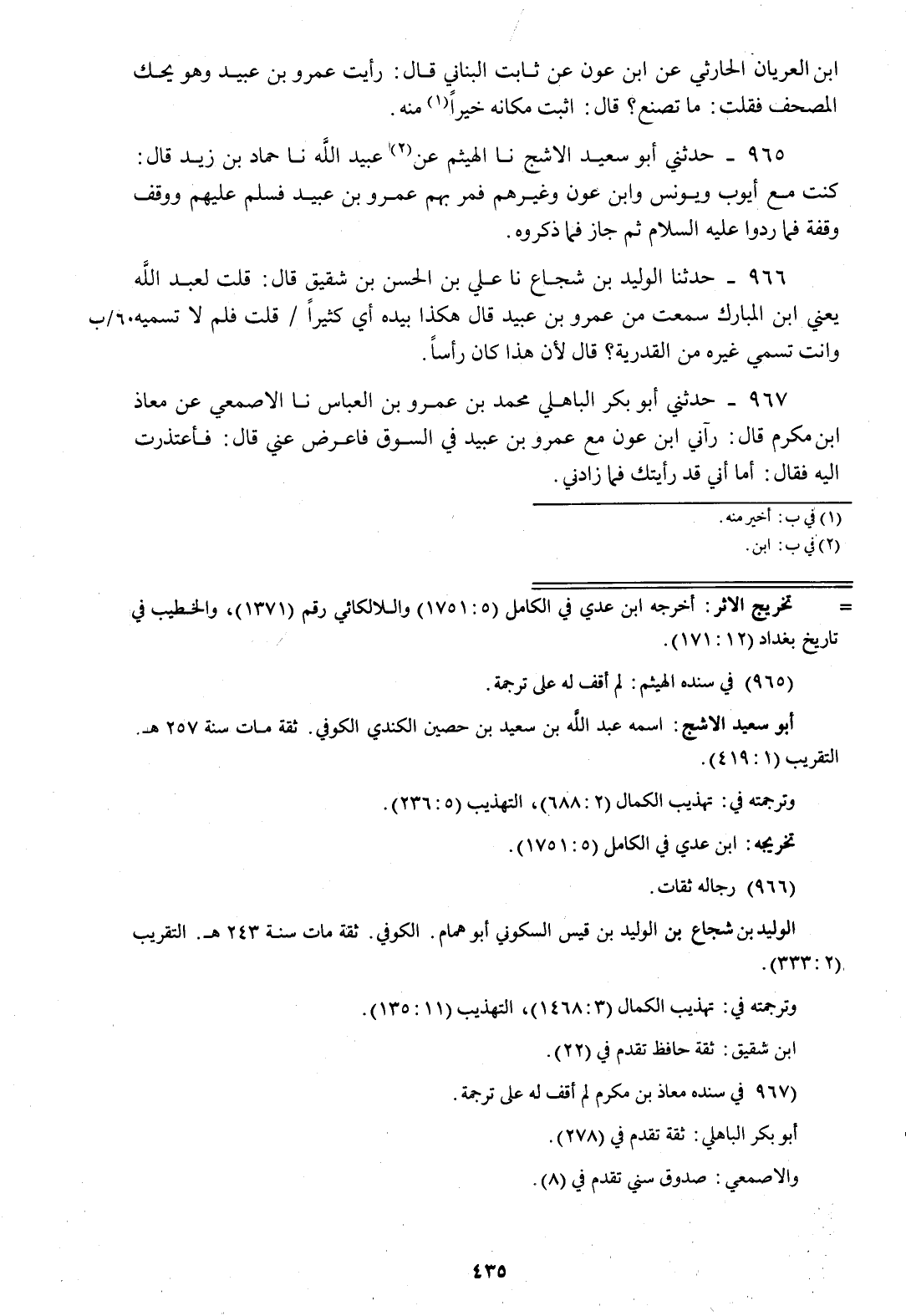 965 - حَدَّثَنِي أَبُو سَعِيدٍ الْأَشَجُّ، نا الْهَيْثَمُ، عَنْ عُبَيْدِ اللَّهِ، نا حَمَّادُ بْنُ زَيْدٍ، قَالَ: «كُنْتُ مَعَ أَيُّوبَ وَيُونُسَ وَابْنِ عَوْنٍ وَغَيْرِهِمْ، §فَمَرَّ بِهِمْ عَمْرُو بْنُ عُبَيْدٍ، فَسَلَّمَ عَلَيْهِمْ وَوَقَفَ وَقْفَةً، فَمَا رَدُّوا عَلَيْهِ السَّلَامَ، ثُمَّ جَازَ فَمَا ذَكَرُوهُ»