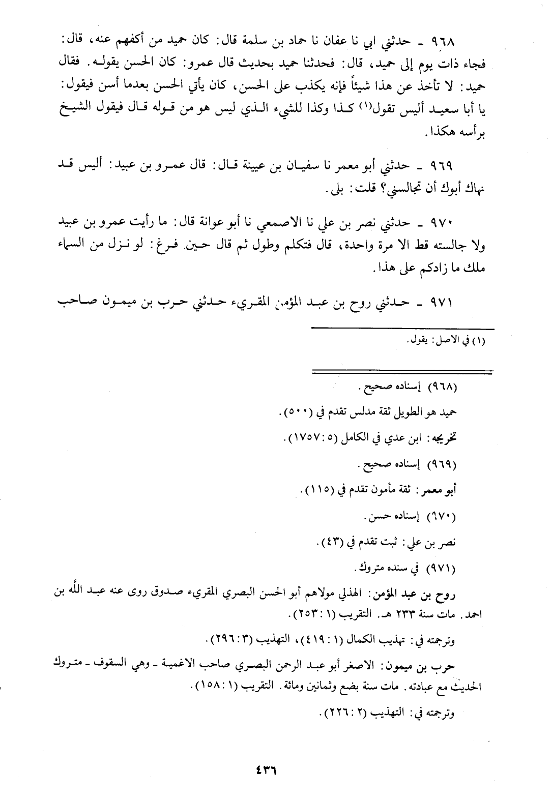 968 - حَدَّثَنِي أَبِي نا عَفَّانُ، نا حَمَّادُ بْنُ سَلَمَةَ، قَالَ: " كَانَ حُمَيْدٌ مِنْ أَكَفِّهِمْ عَنْهُ، قَالَ: فَجَاءَ ذَاتَ يَوْمٍ إِلَى حُمَيْدٍ قَالَ: فَحَدَّثَنَا حُمَيْدٌ بِحَدِيثٍ قَالَ عَمْرٌو: كَانَ الْحَسَنُ يَقُولُهُ، فَقَالَ حُمَيْدٌ: §لَا تَأْخُذْ عَنْ هَذَا شَيْئًا فَإِنَّهُ يَكْذِبُ عَلَى الْحَسَنِ، كَانَ يَأْتِي الْحَسَنَ بَعْدَمَا أَسَنَّ فَيَقُولُ: يَا أَبَا سَعِيدٍ، أَلَيْسَ تَقُولُ كَذَا وَكَذَا؟ لِلشَّيْءِ الَّذِي لَيْسَ هُوَ مِنْ قَوْلِهِ، قَالَ: فَيَقُولُ الشَّيْخُ بِرَأْسِهِ هَكَذَا "