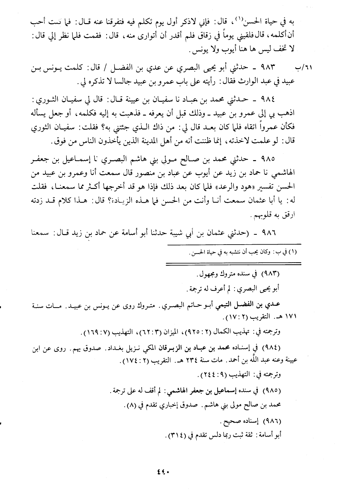 983 - حَدَّثَنِي أَبُو يَحْيَى الْبَصْرِيُّ، عَنْ عَدِيِّ بْنِ الْفَضْلِ، قَالَ: كَلَّمْتُ يُونُسَ بْنَ عُبَيْدٍ فِي عَبْدِ الْوَارِثِ، فَقَالَ: «§رَأَيْتُهُ عَلَى بَابِ عَمْرِو بْنِ عُبَيْدٍ جَالِسًا، لَا تَذْكُرْهُ لِي»