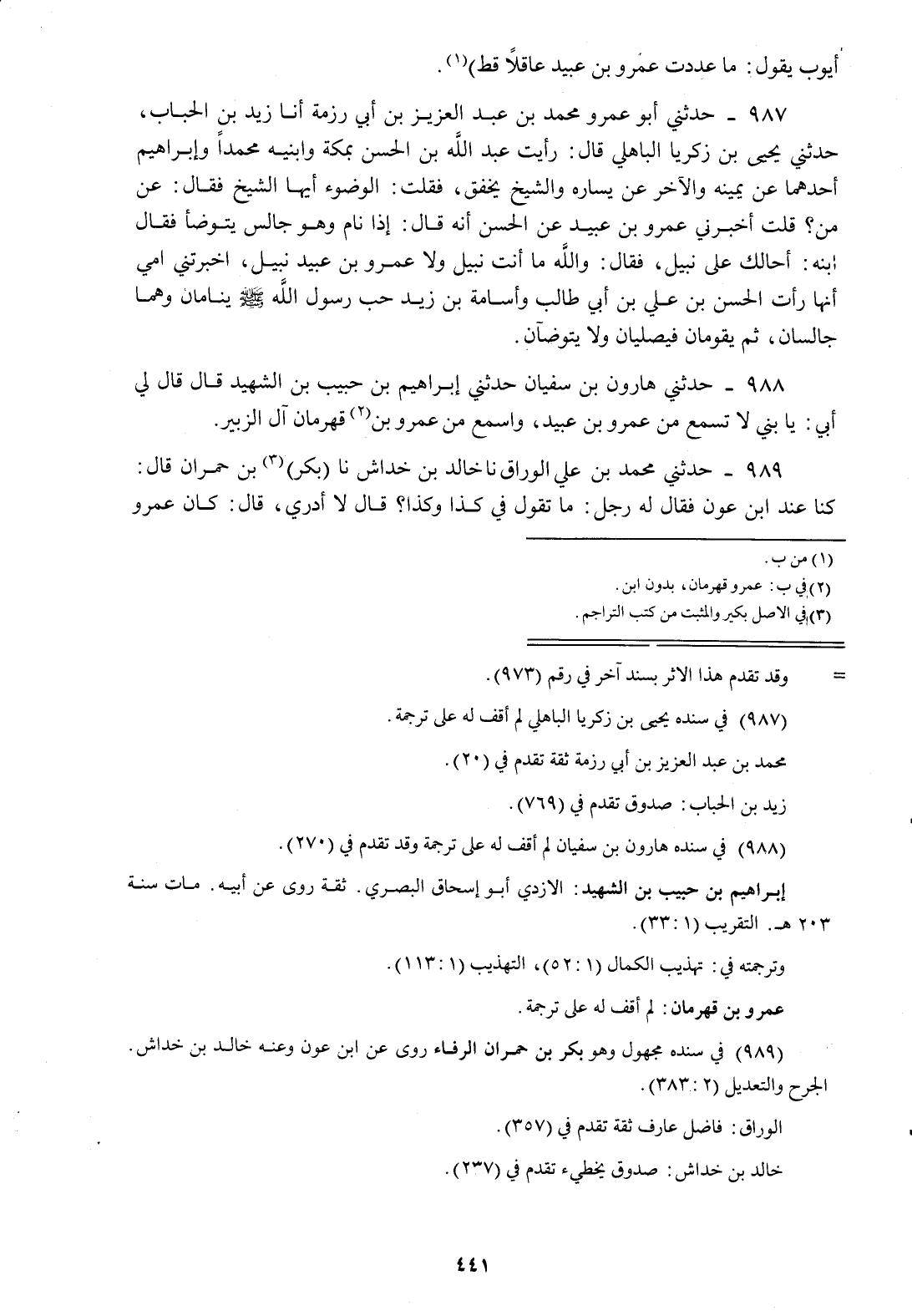 988 - حَدَّثَنِي هَارُونُ بْنُ سُفْيَانَ، حَدَّثَنِي إِبْرَاهِيمُ بْنُ حَبِيبِ بْنِ الشَّهِيدِ، قَالَ: قَالَ لِي أَبِي: «يَا بُنِيَّ §لَا تَسْمَعْ مِنْ عَمْرِو بْنِ عُبَيْدٍ، وَاسْمَعْ مِنْ عَمْرِو بْنِ قَهْرَمَانَ آلِ الزُّبَيْرِ»