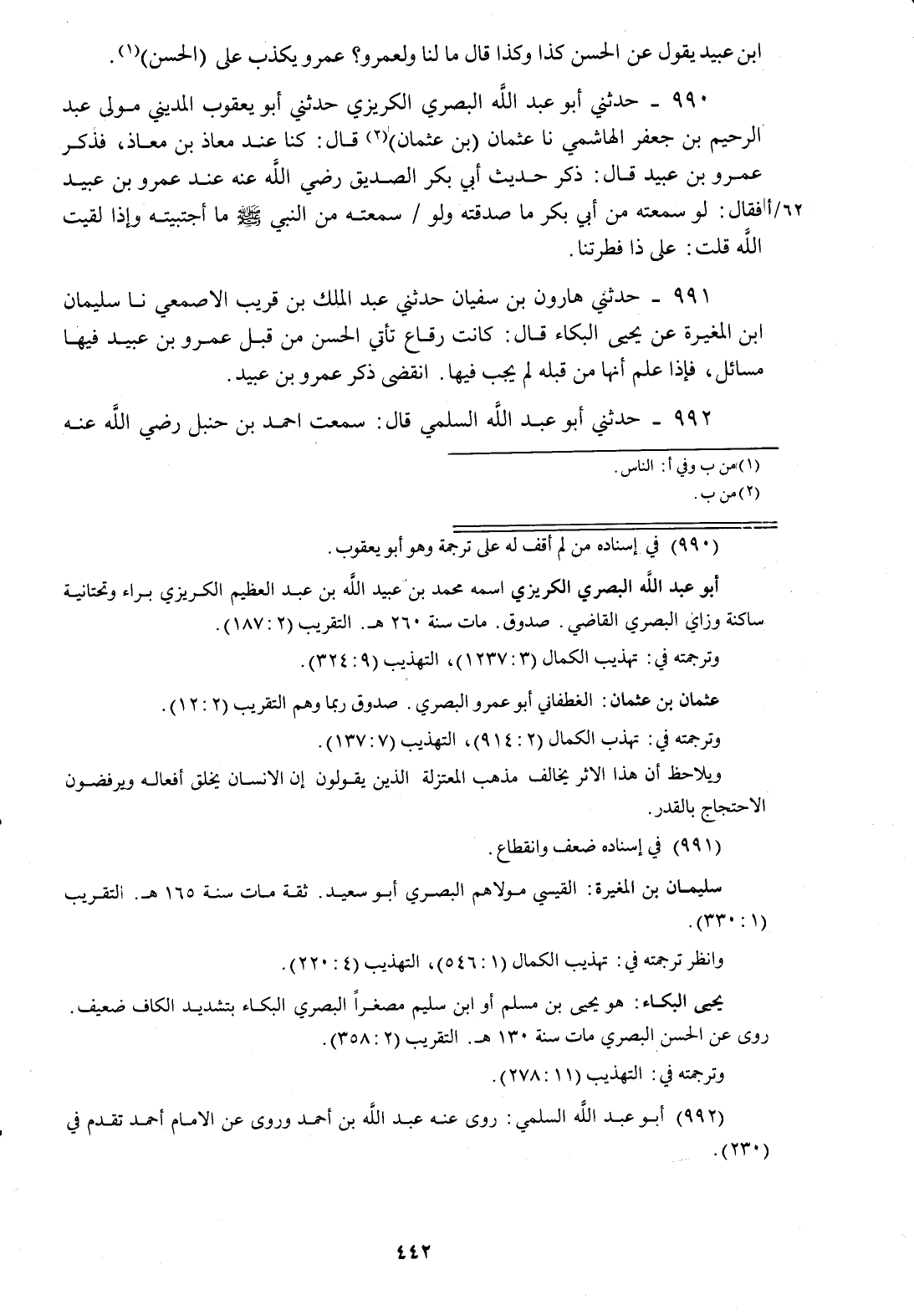990 - حَدَّثَنِي أَبُو عَبْدِ اللَّهِ الْبَصْرِيُّ الْكَرِيزِيُّ، حَدَّثَنِي أَبُو يَعْقُوبَ الْمَدِينِيُّ، مَوْلَى عَبْدِ الرَّحِيمِ بْنِ جَعْفَرٍ الْهَاشِمِيِّ، نا عُثْمَانُ بْنُ عُثْمَانَ، قَالَ: " كُنَّا عِنْدَ مُعَاذِ بْنِ مُعَاذٍ فَذُكِرَ عَمْرُو بْنُ عُبَيْدٍ، قَالَ: §ذُكِرَ حَدِيثُ أَبِي بَكْرٍ الصِّدِّيقِ رَضِيَ اللَّهُ عَنْهُ عِنْدَ عَمْرِو بْنِ عُبَيْدٍ فَقَالَ: لَوْ سَمِعْتُهُ مِنْ أَبِي بَكْرٍ مَا صَدَّقْتُهُ، وَلَوْ سَمِعْتُهُ مِنَ النَّبِيِّ صَلَّى اللهُ عَلَيْهِ وَسَلَّمَ مَا اجْتَبَيْتُهُ، وَإِذَا لَقِيتُ اللَّهَ قُلْتُ عَلَى ذَا فَطَرْتَنَا؟ "