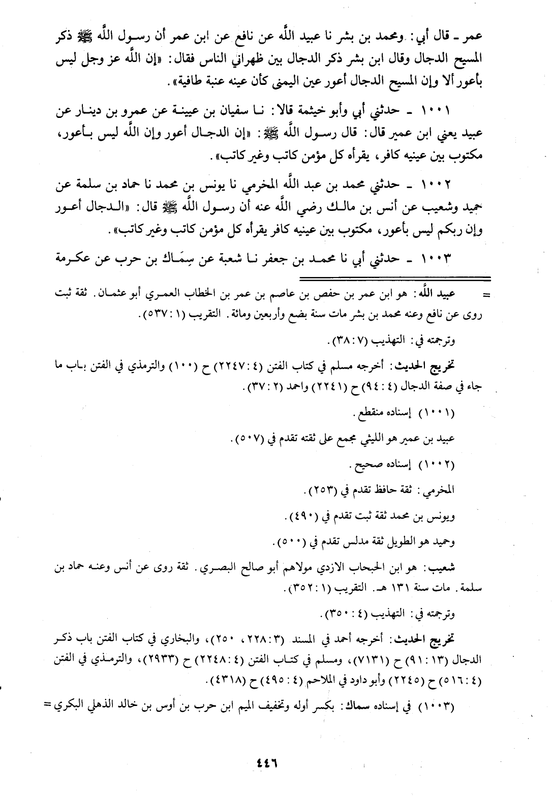 1001 - حَدَّثَنِي أَبِي وَأَبُو خَيْثَمَةَ قَالَا: نا سُفْيَانُ بْنُ عُيَيْنَةَ، عَنْ عَمْرِو بْنِ دِينَارٍ، عَنْ عُبَيْدٍ يَعْنِي ابْنَ عُمَيْرٍ، قَالَ: قَالَ رَسُولُ اللَّهِ صَلَّى اللهُ عَلَيْهِ وَسَلَّمَ: «§إِنَّ الدَّجَّالَ أَعْوَرُ وَإِنَّ اللَّهَ لَيْسَ بِأَعْوَرَ، مَكْتُوبٌ بَيْنَ عَيْنَيْهِ كَافِرٌ يَقْرَأُهُ كُلُّ مُؤْمِنٍ كَاتِبٌ وَغَيْرُ كَاتِبٍ»