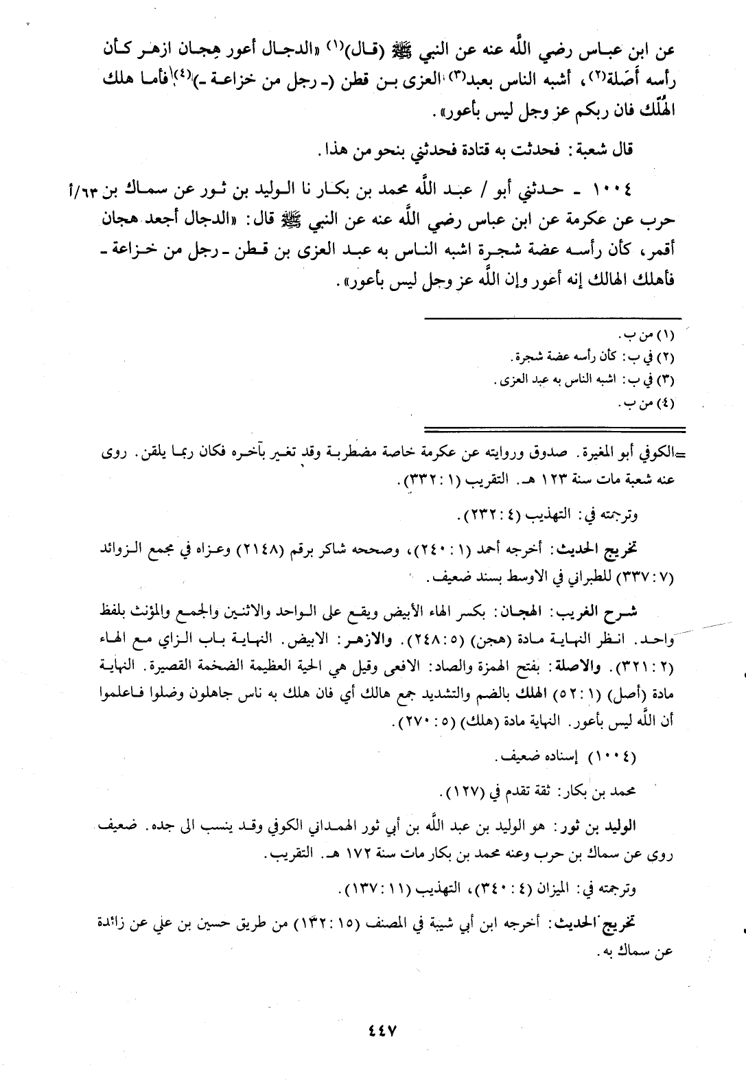 1004 - حَدَّثَنِي أَبُو عَبْدِ اللَّهِ مُحَمَّدُ بْنُ بَكَّارٍ، نا الْوَلِيدُ بْنُ ثَوْرٍ، عَنْ سِمَاكِ بْنِ حَرْبٍ، عَنْ عِكْرِمَةَ، عَنِ ابْنِ عَبَّاسٍ رَضِيَ اللَّهُ عَنْهُ، عَنِ النَّبِيِّ صَلَّى اللهُ عَلَيْهِ وَسَلَّمَ قَالَ: «§الدَّجَّالُ أَجْعَدُ هِجَانٌ أَقْمَرُ كَأَنَّ رَأْسَهُ عِضَةُ شَجَرَةٍ، أَشْبَهُ النَّاسِ بِهِ عَبْدُ الْعُزَّى بْنُ قَطَنٍ رَجُلٌ مِنْ خُزَاعَةَ، فَأُهْلِكَ الْهَالِكُ، إِنَّهُ أَعْوَرُ وَإِنَّ اللَّهَ عَزَّ وَجَلَّ لَيْسَ بِأَعْوَرَ»