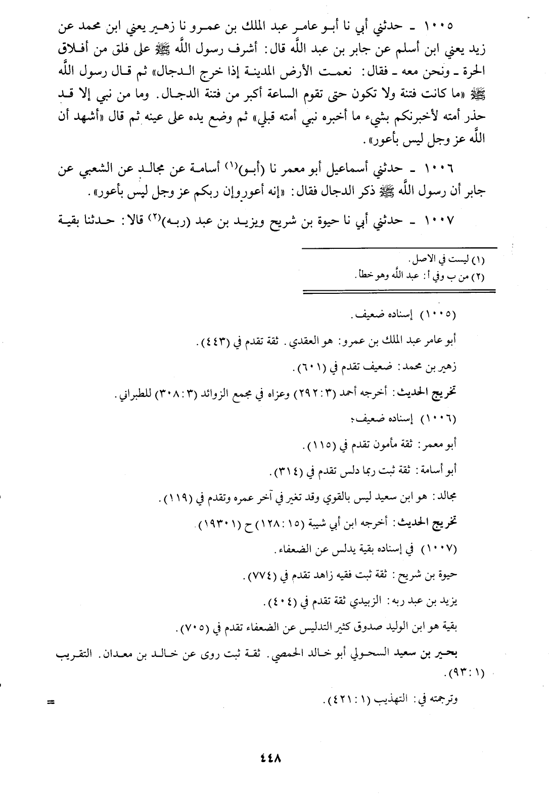 1005 - حَدَّثَنِي أَبِي، نا أَبُو عَامِرٍ عَبْدُ الْمَلِكِ بْنُ عَمْرٍو، نا زُهَيْرٌ يَعْنِي ابْنَ مُحَمَّدٍ، عَنْ زَيْدٍ يَعْنِي ابْنَ أَسْلَمَ، عَنْ جَابِرِ بْنِ عَبْدِ اللَّهِ، قَالَ: أَشْرَفَ رَسُولُ اللَّهِ صَلَّى اللهُ عَلَيْهِ وَسَلَّمَ عَلَى فَلَقٍ مِنْ أَفْلَاقِ الْحَرَّةِ، وَنَحْنُ مَعَهُ فَقَالَ: «نِعْمَتِ الْأَرْضُ الْمَدِينَةُ إِذَا خَرَجَ الدَّجَّالُ» ثُمَّ قَالَ رَسُولُ اللَّهِ صَلَّى اللهُ عَلَيْهِ وَسَلَّمَ: «مَا كَانَتْ فِتْنَةٌ وَلَا تَكُونُ حَتَّى تَقُومَ السَّاعَةُ أَكْبَرَ مِنْ فِتْنَةِ الدَّجَّالِ، وَمَا مِنْ نَبِيٍّ إِلَّا قَدْ حَذَّرَ أُمَّتَهُ، لَأُخْبِرَنَّكُمْ بِشَيْءٍ مَا أَخْبَرَهُ نَبِيُّ أُمَّتَهُ قَبْلِي» ثُمَّ وَضَعَ يَدَهُ عَلَى عَيْنِهِ، ثُمَّ قَالَ: «§أَشْهَدُ أَنَّ اللَّهَ عَزَّ وَجَلَّ لَيْسَ بِأَعْوَرَ»