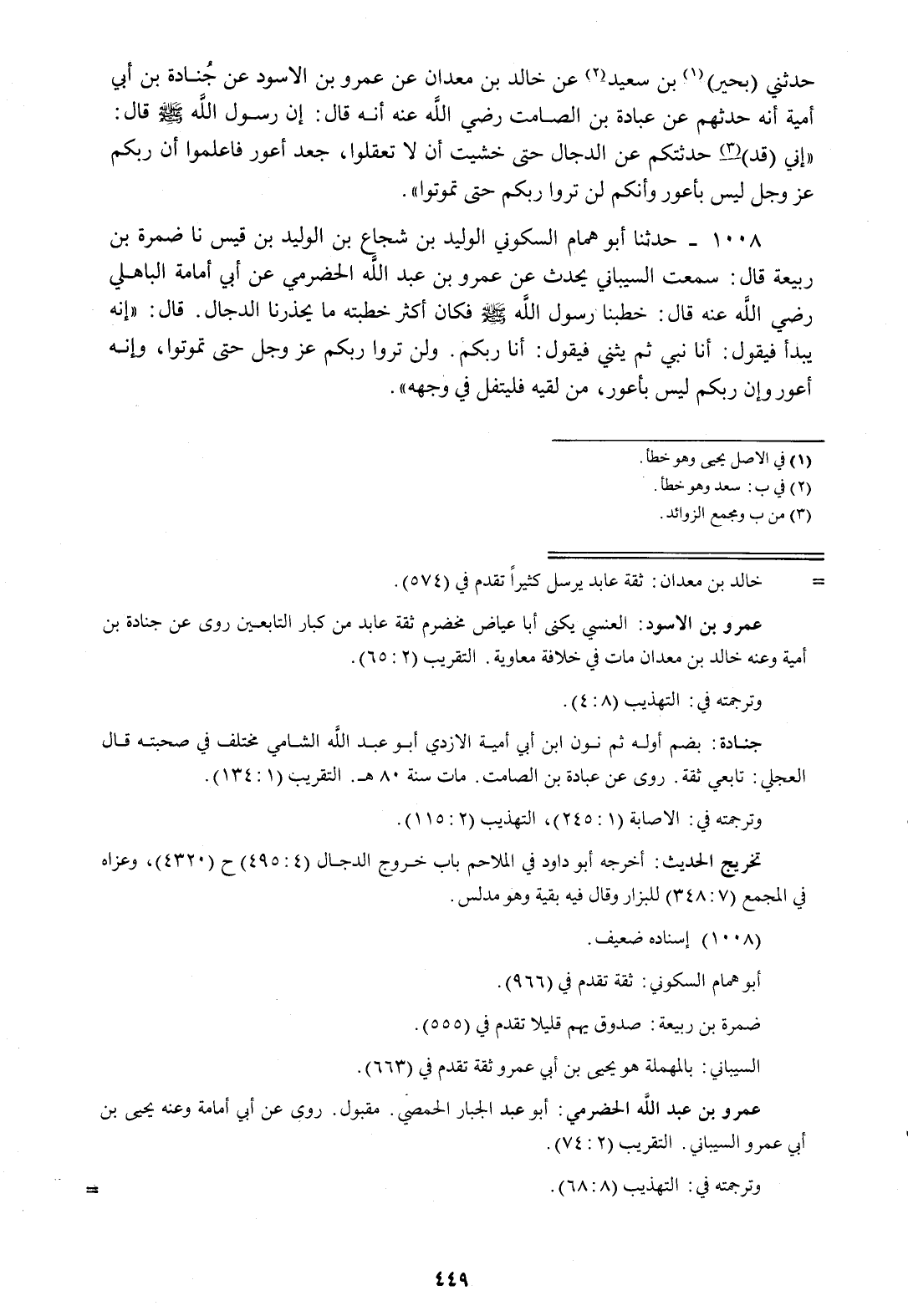 1008 - حَدَّثَنَا أَبُو هَمَّامٍ السَّكُونِيُّ الْوَلِيدُ بْنُ شُجَاعِ بْنِ الْوَلِيدِ بْنِ قَيْسٍ، نا ضَمْرَةُ بْنُ رَبِيعَةَ، قَالَ: سَمِعْتُ السَّيْبَانِيَّ، يُحَدِّثُ عَنْ عَمْرِو بْنِ عَبْدِ اللَّهِ الْحَضْرَمِيِّ، عَنْ أَبِي أُمَامَةَ الْبَاهِلِيِّ رَضِيَ اللَّهُ عَنْهُ قَالَ: خَطَبَنَا رَسُولُ اللَّهِ صَلَّى اللهُ عَلَيْهِ وَسَلَّمَ فَكَانَ أَكْثَرُ خُطْبَتِهِ مَا يُحَذِّرُنَا الدَّجَّالَ، قَالَ: إِنَّهُ §يَبْدَأُ فَيَقُولُ: أَنَا نَبِيٌّ، ثُمَّ يُثَنِّي فَيَقُولُ: أَنَا رَبُّكُمْ، وَلَنْ تَرَوْا رَبَّكُمْ عَزَّ وَجَلَّ حَتَّى تَمُوتُوا، وَإِنَّهُ أَعْوَرُ وَإِنَّ رَبَّكُمْ لَيْسَ بِأَعْوَرَ، مَنْ لَقِيَهُ فَلْيَتْفُلْ فِي وَجْهِهِ "
