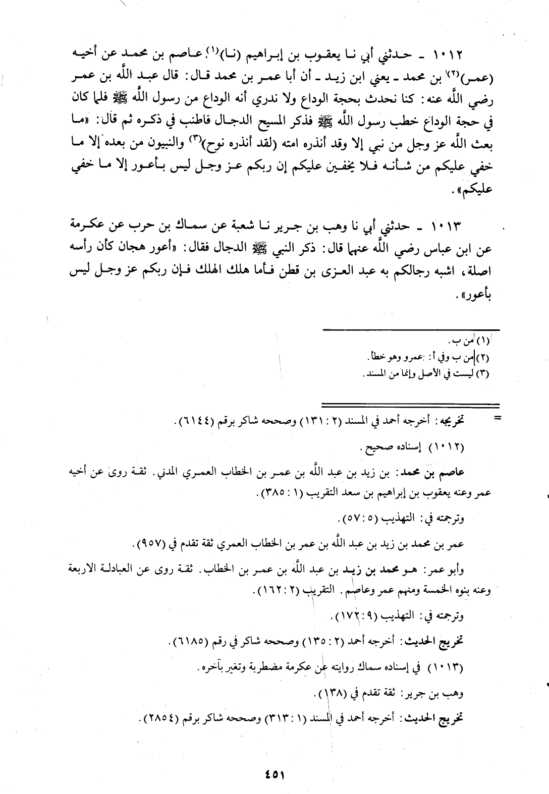 1012 - حَدَّثَنِي أَبِي، نا يَعْقُوبُ بْنُ إِبْرَاهِيمَ، نا عَاصِمُ بْنُ مُحَمَّدٍ، عَنْ أَخِيهِ، عُمَرَ بْنِ مُحَمَّدٍ يَعْنِي ابْنَ زَيْدٍ، أَنَّ أَبَا عُمَرَ بْنَ مُحَمَّدٍ، قَالَ: قَالَ عَبْدُ اللَّهِ بْنُ عُمَرَ رَضِيَ اللَّهُ عَنْهُ: كُنَّا نُحَدِّثُ بِحَجَّةِ الْوَدَاعِ وَلَا نَدْرِي أَنَّهُ الْوَدَاعَ مِنْ رَسُولِ اللَّهِ صَلَّى اللهُ عَلَيْهِ وَسَلَّمَ، فَلَمَّا كَانَ فِي حَجَّةِ الْوَدَاعِ خَطَبَ رَسُولُ اللَّهِ صَلَّى اللهُ عَلَيْهِ وَسَلَّمَ فَذَكَرَ الْمَسِيحَ الدَّجَّالَ، فَأَطْنَبَ فِي ذِكْرِهِ، ثُمَّ قَالَ «مَا بَعَثَ اللَّهُ عَزَّ وَجَلَّ مِنْ نَبِيٍّ إِلَّا وَقَدْ أَنْذَرَهُ أُمَّتَهُ، لَقَدْ أَنْذَرَهُ نُوحٌ وَالنَّبِيُّونَ مِنْ بَعْدِهِ إِلَّا مَا خَفِيَ عَلَيْكُمْ مِنْ شَأْنِهِ، فَلَا يَخْفَيَنَّ عَلَيْكُمْ، §إِنَّ رَبَّكُمْ عَزَّ وَجَلَّ لَيْسَ بِأَعْوَرَ إِلَّا مَا خَفِيَ عَلَيْكُمْ»