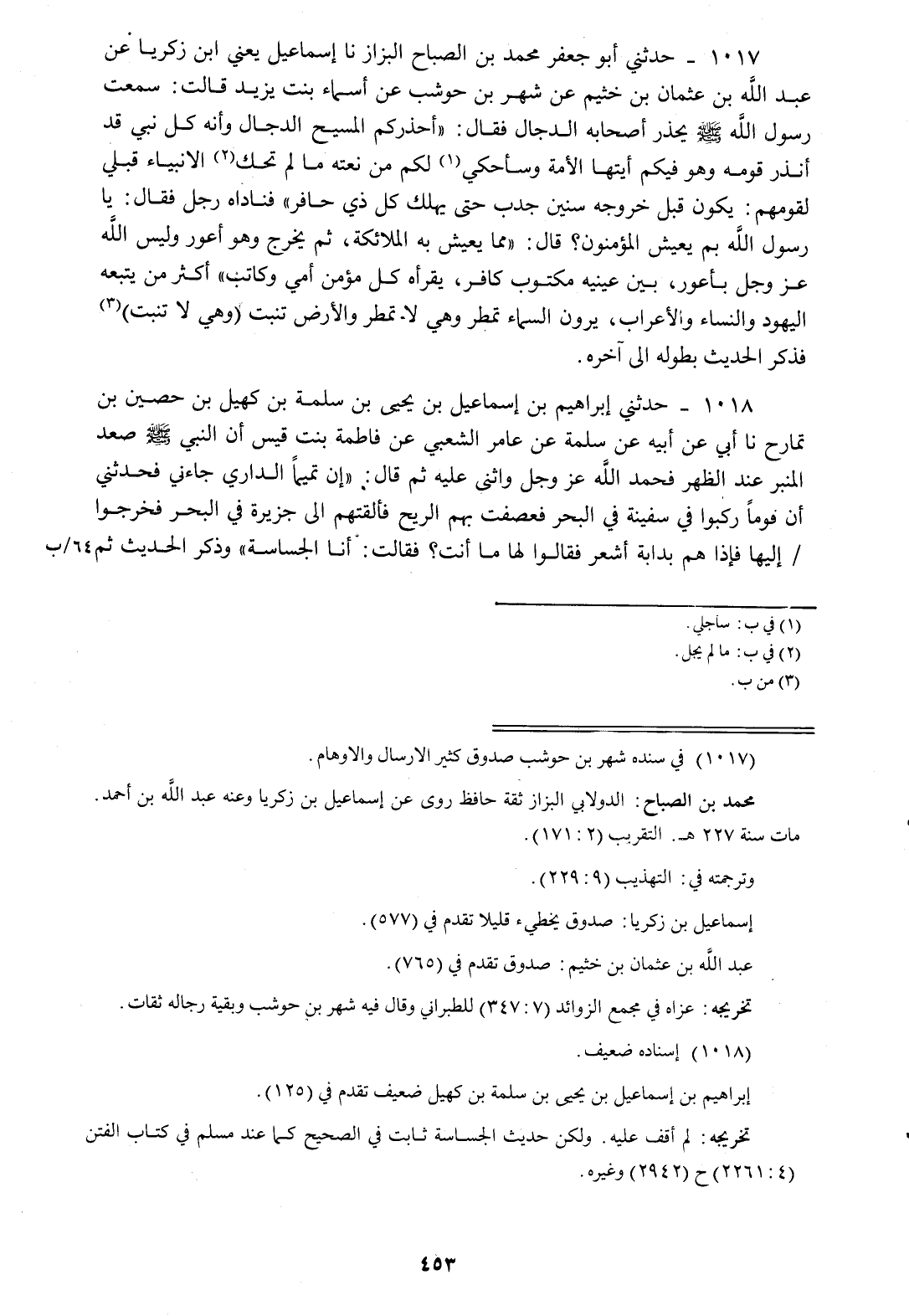 1017 - حَدَّثَنِي أَبُو جَعْفَرٍ مُحَمَّدُ بْنُ الصَّبَّاحِ الْبَزَّازُ نا إِسْمَاعِيلُ يَعْنِي ابْنَ زَكَرِيَّا، عَنْ عَبْدِ اللَّهِ بْنِ عُثْمَانَ بْنِ خُثَيْمٍ، عَنْ شَهْرِ بْنِ حَوْشَبٍ، عَنْ أَسْمَاءَ بِنْتِ يَزِيدَ، قَالَتْ: سَمِعْتُ رَسُولَ اللَّهِ صَلَّى اللهُ عَلَيْهِ وَسَلَّمَ يُحَذِّرُ أَصْحَابَهُ الدَّجَّالَ، فَقَالَ: " أُحَذِّرُكُمُ الْمَسِيحَ الدَّجَّالَ، وَأَنَّهُ كُلُّ نَبِيٍّ قَدْ أَنْذَرَ قَوْمَهُ، وَهُوَ فِيكُمْ أَيَّتُهَا الْأُمَّةُ، §وَسَأَحْكِي لَكُمْ مِنْ نَعْتِهِ مَا لَمْ تَحْكِ الْأَنْبِيَاءُ قَبْلِي لِقَوْمِهِمْ، يَكُونُ قَبْلَ خُرُوجِهِ سِنِينَ جَدْبٍ حَتَّى يَهْلِكَ كُلُّ ذِي حَافِرٍ، فَنَادَاهُ رَجُلٌ فَقَالَ: يَا رَسُولَ اللَّهِ بِمَ يَعِيشُ الْمُؤْمِنُونَ؟ قَالَ: «مِمَّا يَعِيشُ بِهِ الْمَلَائِكَةُ، ثُمَّ يَخْرُجُ وَهُوَ أَعْوَرُ، وَلَيْسَ اللَّهُ عَزَّ وَجَلَّ بِأَعْوَرَ، بَيْنَ عَيْنَيْهِ مَكْتُوبٌ كَافِرٌ يَقْرَأُهُ كُلُّ مُؤْمِنٍ أُمِّيٍّ وَكَاتِبٌ، أَكْثَرُ مَنْ يَتْبَعُهُ الْيَهُودُ وَالنِّسَاءُ وَالْأَعْرَابُ، يَرَوْنَ السَّمَاءَ تُمْطِرُ وَهِيَ لَا تُمْطِرُ، وَالْأَرْضَ تَنْبُتُ وَهِيَ لَا تُنْبِتُ» فَذَكَرَ الْحَدِيثَ بِطُولِهِ إِلَى آخِرِهِ