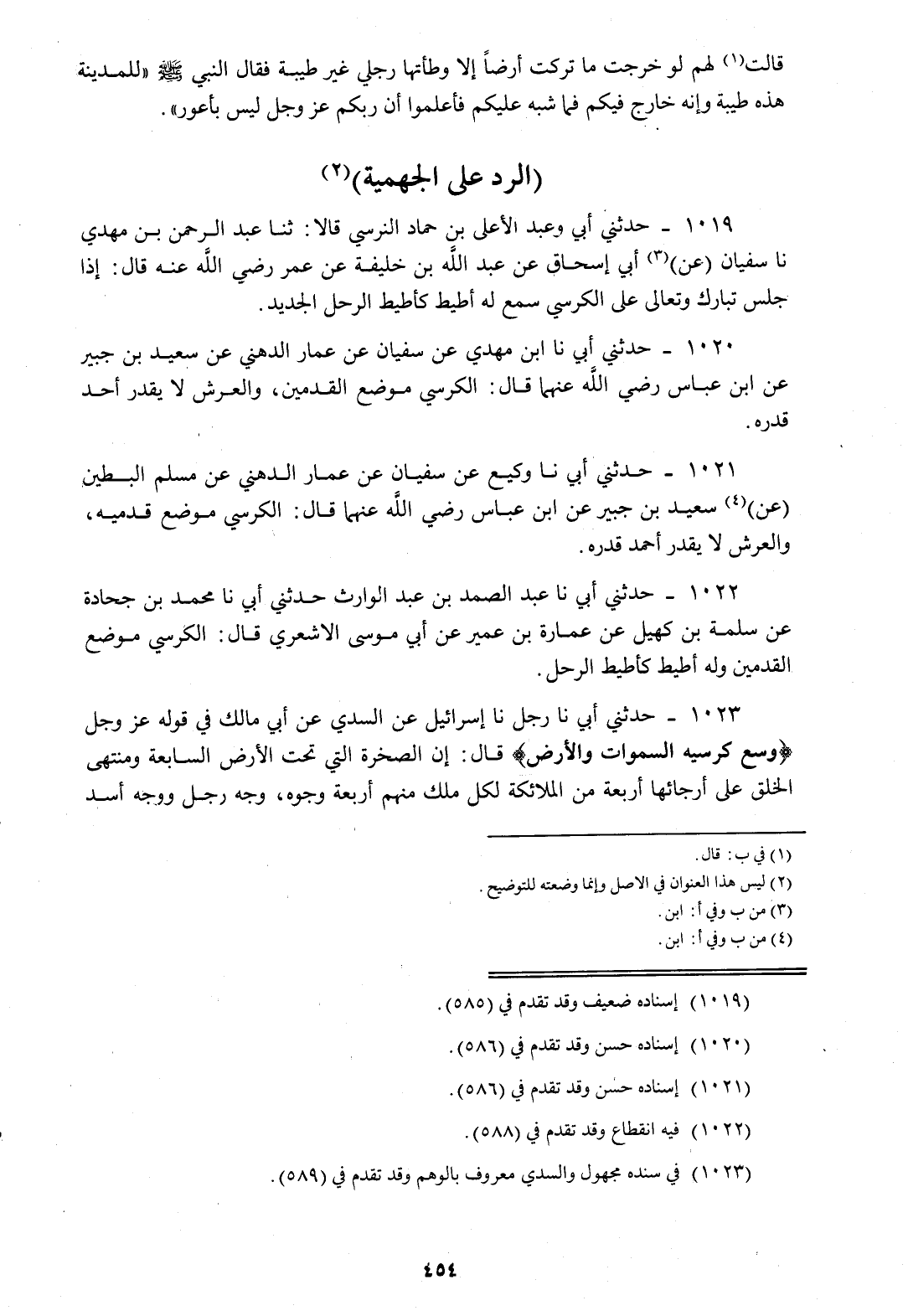 1019 - حَدَّثَنِي أَبِي وَعَبْدُ الْأَعْلَى بْنُ حَمَّادٍ النَّرْسِيُّ، قَالَا: ثنا عَبْدُ الرَّحْمَنِ بْنُ مَهْدِيٍّ، نا سُفْيَانُ، عَنْ أَبِي إِسْحَاقَ، عَنْ عَبْدِ اللَّهِ بْنِ خَلِيفَةَ، عَنْ عُمَرَ رَضِيَ اللَّهُ عَنْهُ قَالَ: «§إِذَا جَلَسَ تَبَارَكَ وَتَعَالَى عَلَى الْكُرْسِيِّ سُمِعَ لَهُ أَطِيطٌ كَأَطِيطِ الرَّحْلِ الْجَدِيدِ»