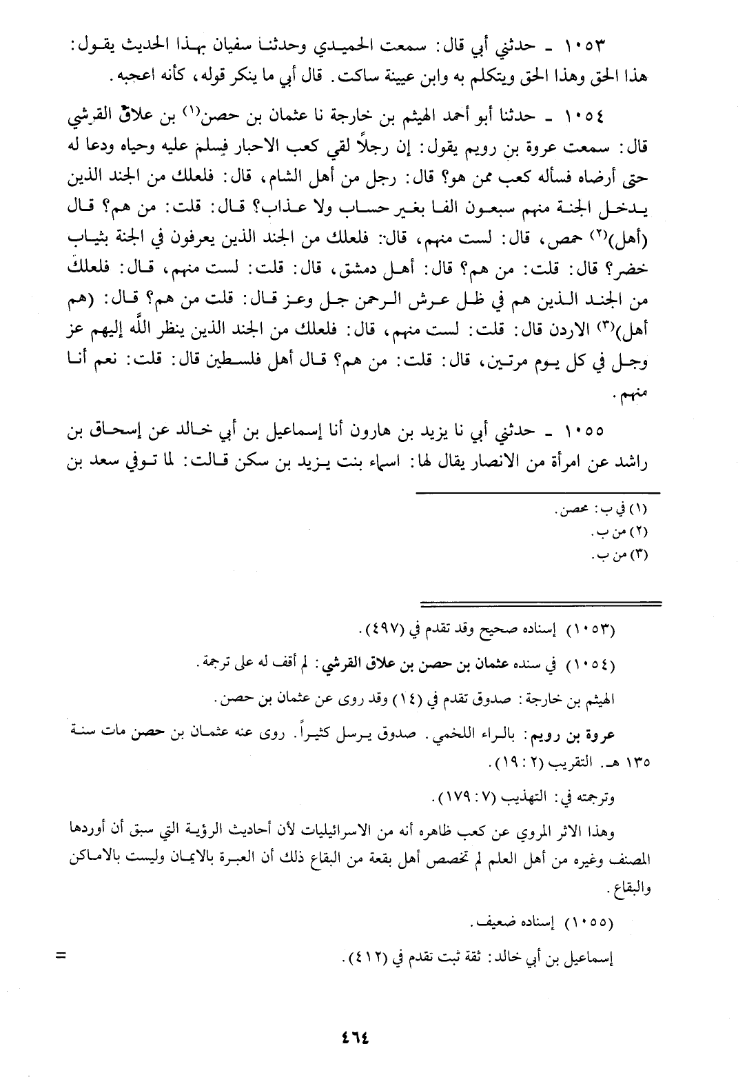 1054 - حَدَّثَنَا أَبُو أَحْمَدَ الْهَيْثَمُ بْنُ خَارِجَةَ، نا عُثْمَانُ بْنُ حِصْنِ بْنِ عَلَّاقٍ الْقُرَشِيُّ، قَالَ: سَمِعْتُ عُرْوَةَ بْنَ رُوَيْمٍ، يَقُولُ: إِنَّ رَجُلًا لَقِيَ كَعْبَ الْأَحْبَارِ فَسَلَّمَ عَلَيْهِ وَحَيَّاهُ، وَدَعَا لَهُ حَتَّى أَرْضَاهُ، فَسَأَلَهُ كَعْبٌ «مِمَّنْ هُوَ؟» قَالَ: رَجُلٌ مِنْ أَهْلِ الشَّامِ، قَالَ: «§فَلَعَلَّكَ مِنَ الْجُنْدِ الَّذِينَ يَدْخُلُ الْجَنَّةَ مِنْهُمْ سَبْعُونَ أَلْفًا بِغَيْرِ حِسَابٍ وَلَا عَذَابٍ»، قَالَ: قُلْتُ: مَنْ هُمْ؟ قَالَ: «أَهْلُ حِمْصَ،» قَالَ: لَسْتُ مِنْهُمْ، قَالَ: «فَلَعَلَّكَ مِنَ الْجُنْدِ الَّذِينَ يُعْرَفُونَ فِي الْجَنَّةِ بِثِيَابٍ خُضْرٍ»، قَالَ: قُلْتُ: مَنْ هُمْ؟ قَالَ: " أَهْلُ دِمَشْقَ، قَالَ: قُلْتُ لَسْتُ مِنْهُمْ، قَالَ: «فَلَعَلَّكَ مِنَ الْجُنْدِ الَّذِينَ هُمْ فِي ظِلِّ عَرْشِ الرَّحْمَنِ جَلَّ وَعَزَّ»، قَالَ: قُلْتُ: مَنْ هُمْ؟ قَالَ: «هُمْ أَهْلُ الْأُرْدُنِّ»، قَالَ: قُلْتُ: لَسْتُ مِنْهُمْ، قَالَ: «فَلَعَلَّكَ مِنَ الْجُنْدِ الَّذِينَ يَنْظُرُ اللَّهُ إِلَيْهِمْ عَزَّ وَجَلَّ فِي كُلِّ يَوْمٍ مَرَّتَيْنِ»، قَالَ: قُلْتُ: مَنْ هُمْ؟ قَالَ: «أَهْلُ فِلَسْطِينَ»، قَالَ: قُلْتُ: نَعَمْ، أَنَا مِنْهُمُ