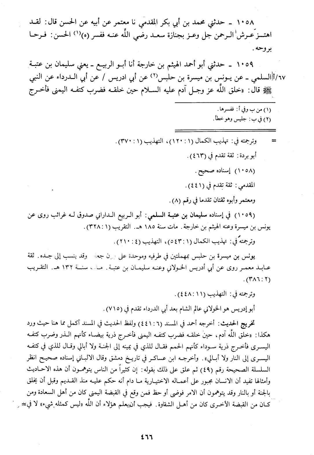1059 - حَدَّثَنِي أَبُو أَحْمَدَ الْهَيْثَمُ بْنُ خَارِجَةَ، أَنَا أَبُو الرَّبِيعِ يَعْنِي سُلَيْمَانَ بْنَ عُتْبَةَ السُّلَمِيَّ، عَنْ يُونُسَ بْنِ مَيْسَرَةَ بْنِ حَلْبَسٍ، عَنْ أَبِي إِدْرِيسَ، عَنْ أَبِي الدَّرْدَاءِ، عَنِ النَّبِيِّ صَلَّى اللهُ عَلَيْهِ وَسَلَّمَ قَالَ: " §خَلَقَ اللَّهُ عَزَّ وَجَلَّ آدَمَ عَلَيْهِ السَّلَامُ حِينَ خَلَقَهُ فَضَرَبَ كَتِفَهُ الْيُمْنَى، فَأَخْرَجَ -[467]- ذُرِّيَّتَهُ سَوْدَاءَ كَأَنَّهُمُ الْحُمَمُ، فَقَالَ لِلَّذِي فِي يَمِينِهِ: إِلَى الْجَنَّةِ وَلَا أُبَالِي، وَقَالَ لِلَّذِي فِي يَسَارِهِ: إِلَى النَّارِ وَلَا أُبَالِي "