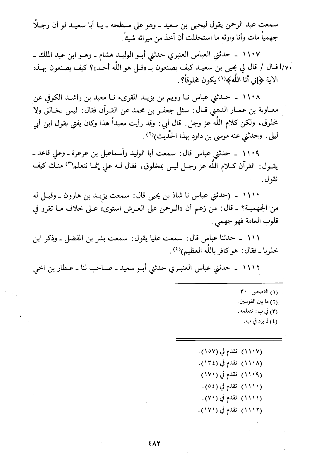 1107 - حَدَّثَنِي الْعَبَّاسُ الْعَنْبَرِيُّ، حَدَّثَنِي أَبُو الْوَلِيدِ هِشَامٌ وَهُوَ ابْنُ عَبْدِ الْمَلِكِ، قَالَ: قَالَ لِي يَحْيَى بْنُ سَعِيدٍ: §كَيْفَ يَصْنَعُونَ بِقُلْ هُوَ اللَّهُ أَحَدٌ كَيْفَ يَصْنَعُونَ بِهَذِهِ الْآيَةِ؟ {إِنِّي أَنَا اللَّهُ} [القصص: 30] يَكُونُ مَخْلُوقًا؟ "