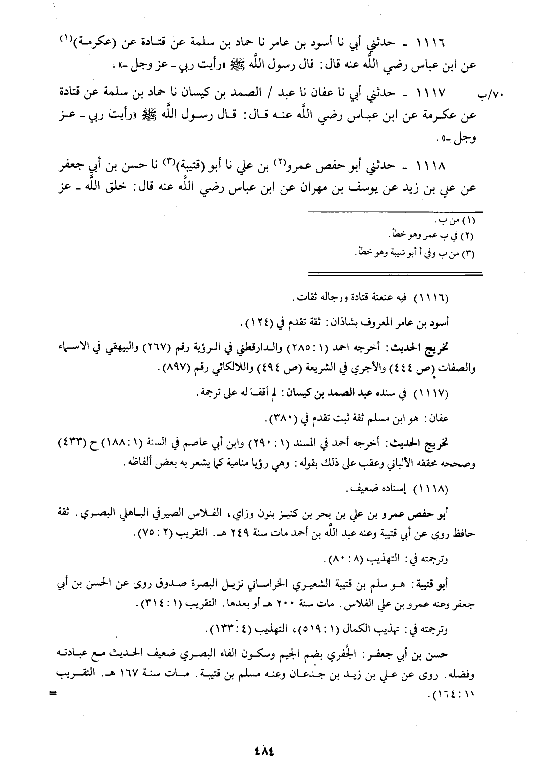 1116 - حَدَّثَنِي أَبِي، نا أَسْوَدُ بْنُ عَامِرٍ، نا حَمَّادُ بْنُ سَلَمَةَ، عَنْ قَتَادَةَ، عَنْ عِكْرِمَةَ، عَنِ ابْنِ عَبَّاسٍ رَضِيَ اللَّهُ عَنْهُ قَالَ: قَالَ رَسُولُ اللَّهِ صَلَّى اللهُ عَلَيْهِ وَسَلَّمَ: «§رَأَيْتُ رَبِّي عَزَّ وَجَلَّ»