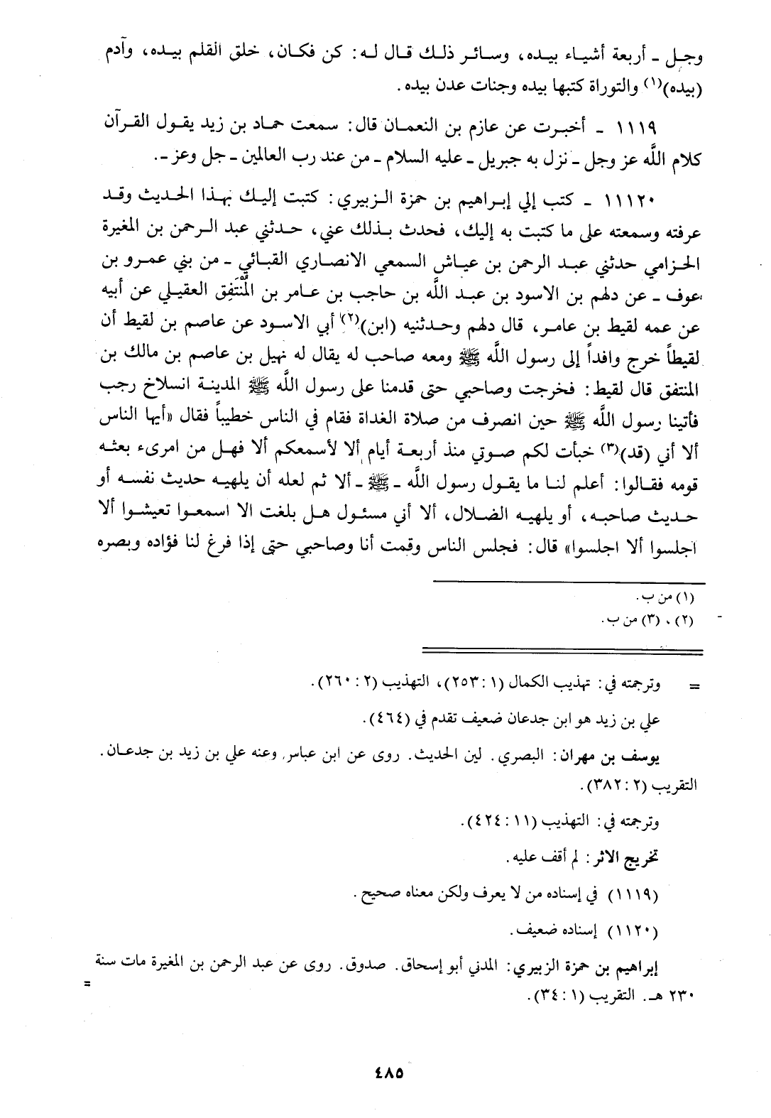 1119 - أُخْبِرْتُ عَنْ عَارِمٍ أَبِي النُّعْمَانِ، قَالَ: سَمِعْتُ حَمَّادَ بْنَ زَيْدٍ، يَقُولُ: «§الْقُرْآنُ كَلَامُ اللَّهِ عَزَّ وَجَلَّ نَزَلَ بِهِ جِبْرِيلُ عَلَيْهِ السَّلَامُ مِنْ عِنْدِ رَبِّ الْعَالَمِينَ جَلَّ وَعَزَّ»