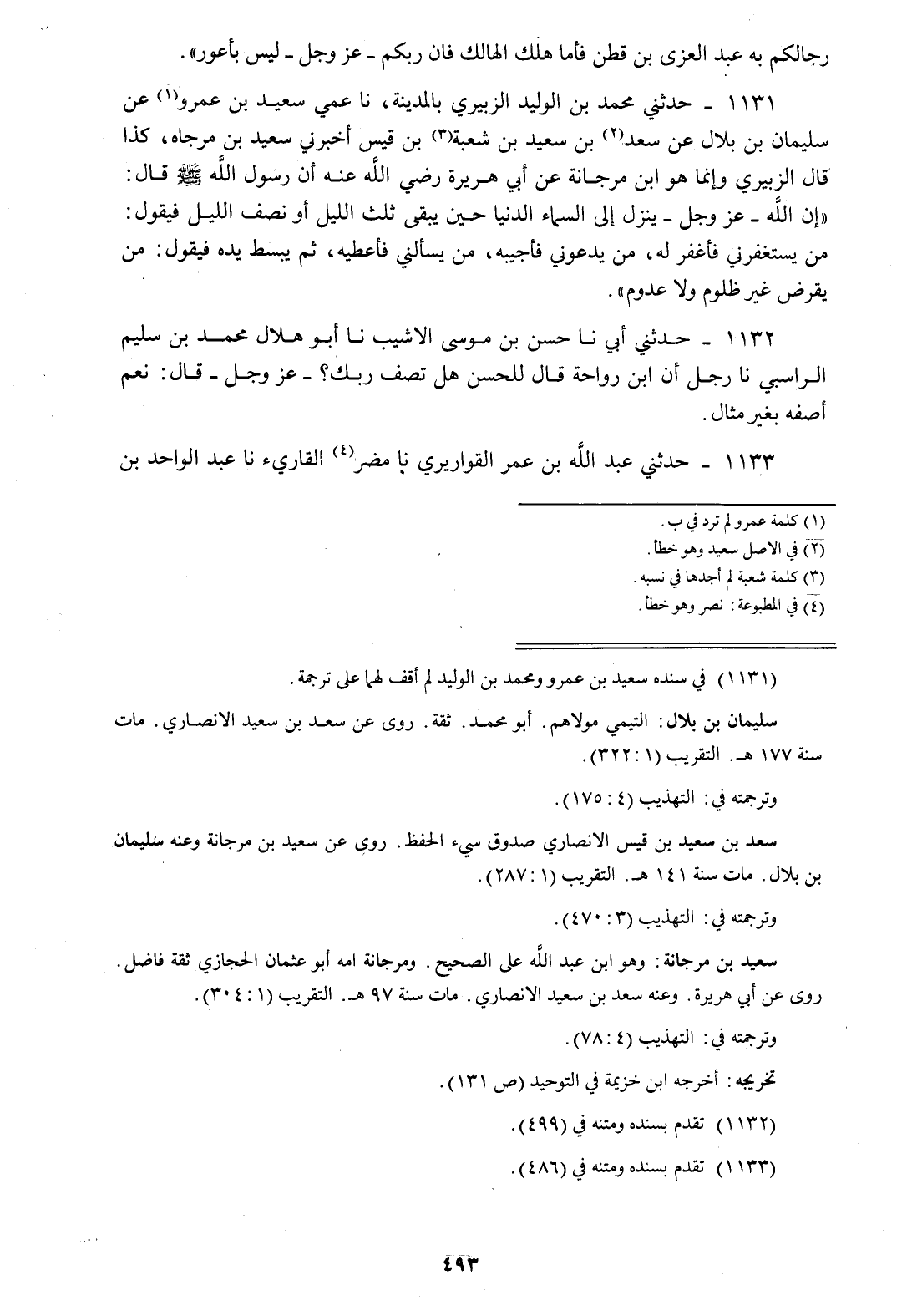 1131 - حَدَّثَنِي مُحَمَّدُ بْنُ الْوَلِيدِ الزُّبَيْرِيُّ، بِالْمَدِينَةِ، نا عَمِّي سَعِيدُ بْنُ عَمْرٍو، عَنْ سُلَيْمَانَ بْنِ بِلَالٍ، عَنْ سَعْدِ بْنِ سَعِيدِ بْنِ شُعْبَةَ بْنِ قَيْسٍ، أَخْبَرَنِي سَعِيدُ بْنُ مُرْجَاهْ، كَذَا قَالَ الزُّبَيْرِيُّ، وَإِنَّمَا هُوَ ابْنُ مَرْجَانَةَ، عَنْ أَبِي هُرَيْرَةَ رَضِيَ اللَّهُ عَنْهُ أَنَّ رَسُولَ اللَّهِ صَلَّى اللهُ عَلَيْهِ وَسَلَّمَ قَالَ: إِنَّ اللَّهَ عَزَّ وَجَلَّ يَنْزِلُ إِلَى السَّمَاءِ الدُّنْيَا حِينَ يَبْقَى ثُلُثُ اللَّيْلِ أَوْ نِصْفُ اللَّيْلِ، فَيَقُولُ: «§مَنْ يَسْتَغْفِرُنِي فَأَغْفِرَ لَهُ؟ مَنْ يَدْعُونِي فَأُجِيبَهُ؟ مَنْ يَسْأَلُنِي فَأُعْطِيَهُ؟» ثُمَّ يَبْسُطُ يَدَهُ، فَيَقُولُ: «مَنْ يُقْرِضُ غَيْرَ ظَلُومٍ وَلَا عَدُومٍ»