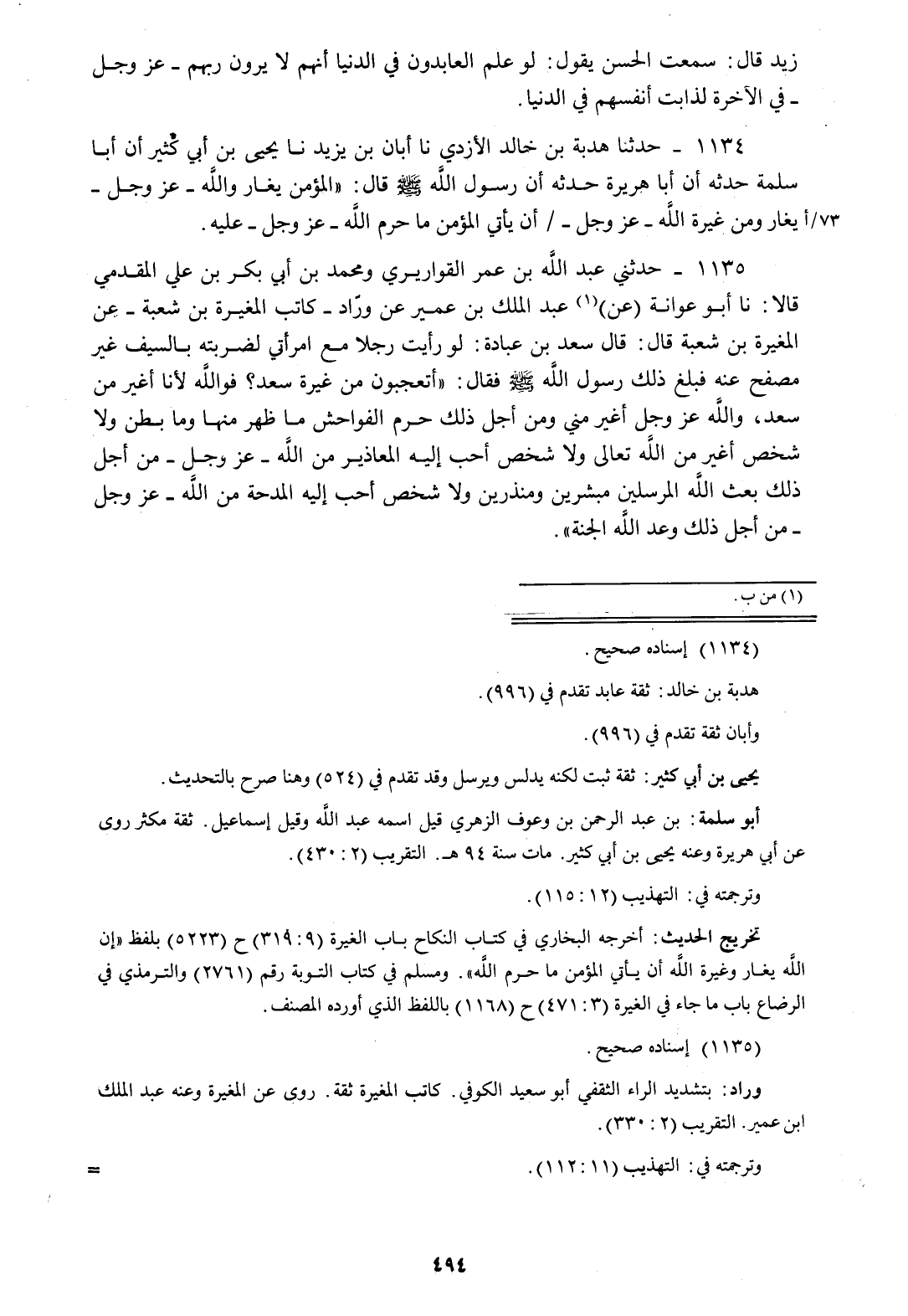 1135 - حَدَّثَنِي عُبَيْدُ اللَّهِ بْنُ عُمَرَ الْقَوَارِيرِيُّ، وَمُحَمَّدُ بْنُ أَبِي بَكْرِ بْنِ عَلِيٍّ الْمُقَدَّمِيُّ، قَالَا: نا أَبُو عَوَانَةَ، عَنْ عَبْدِ الْمَلِكِ بْنِ عُمَيْرٍ، عَنْ وَرَّادٍ، كَاتِبِ الْمُغِيرَةِ بْنِ شُعْبَةَ عَنِ الْمُغِيرَةِ بْنِ شُعْبَةَ، قَالَ: قَالَ سَعْدُ بْنُ عُبَادَةَ: لَوْ رَأَيْتُ رَجُلًا مَعَ امْرَأَتِي لَضَرَبْتُهُ بِالسَّيْفِ غَيْرَ مُصْفِحٍ عَنْهُ، فَبَلَغَ ذَلِكَ رَسُولَ اللَّهِ صَلَّى اللهُ عَلَيْهِ وَسَلَّمَ، فَقَالَ: «§أَتَعْجَبُونَ مِنْ غَيْرَةِ سَعْدٍ، فَوَاللَّهِ لَأَنَا أَغْيَرُ مِنْ سَعْدٍ، وَاللَّهُ عَزَّ وَجَلَّ أَغْيَرُ مِنِّي، وَمِنْ أَجْلِ ذَلِكَ حَرَّمَ الْفَوَاحِشَ مَا ظَهَرَ مِنْهَا وَمَا بَطَنَ، وَلَا شَخْصَ أَغْيَرُ مِنَ اللَّهِ تَعَالَى وَلَا شَخْصَ أَحَبُّ إِلَيْهِ الْمَعَاذِيرُ مِنَ اللَّهِ عَزَّ وَجَلَّ مِنْ أَجْلِ ذَلِكَ بَعَثَ اللَّهُ الْمُرْسَلِينَ مُبَشِّرِينَ وَمُنْذِرِينَ، وَلَا شَخْصَ أَحَبُّ إِلَيْهِ الْمِدْحَةُ مِنَ اللَّهِ عَزَّ وَجَلَّ مِنْ أَجْلِ ذَلِكَ وَعَدَ اللَّهُ الْجَنَّةَ»