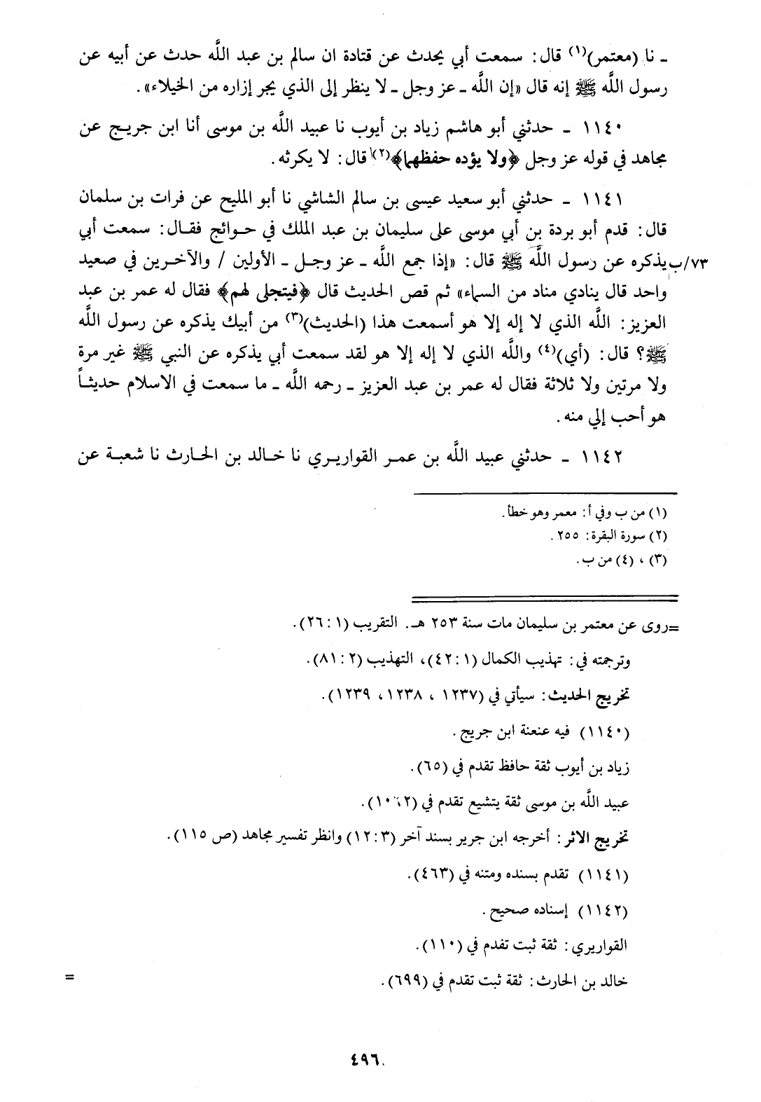 1140 - حَدَّثَنِي أَبُو هَاشِمٍ زِيَادُ بْنُ أَيُّوبَ، نا عُبَيْدُ اللَّهِ بْنُ مُوسَى، أَنَا ابْنُ جُرَيْجٍ، عَنْ مُجَاهِدٍ، فِي قَوْلِهِ، عَزَّ وَجَلَّ: {§وَلَا يَئُودُهُ حِفْظُهُمَا} قَالَ: «لَا يُكْرِثُهُ»