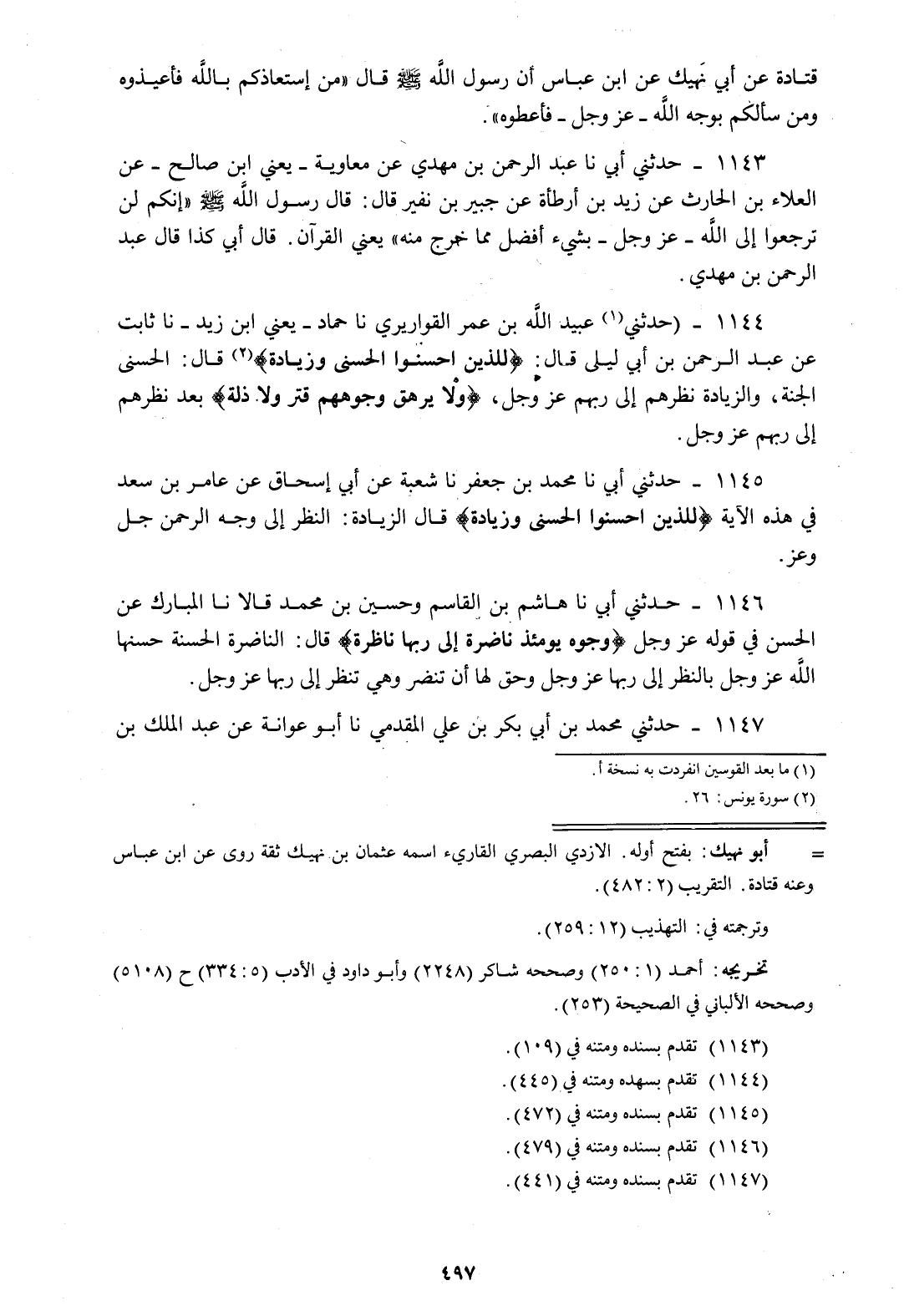 1144 - حَدَّثَنِي عُبَيْدُ اللَّهِ بْنُ عُمَرَ الْقَوَارِيرِيُّ، نا حَمَّادٌ يَعْنِي ابْنَ زَيْدٍ، نا ثَابِتٌ، عَنْ عَبْدِ الرَّحْمَنِ بْنِ أَبِي لَيْلَى، قَالَ: {لِلَّذِينَ أَحْسَنُوا الْحُسْنَى وَزِيَادَةٌ} [يونس: 26] قَالَ: «§الْحُسْنَى الْجَنَّةُ وَالزِّيَادَةُ نَظَرُهُمْ إِلَى رَبِّهِمْ عَزَّ وَجَلَّ وَلَا يَرْهَقُ وُجُوهَهُمْ قَتَرٌ وَلَا ذِلَّةٌ بَعْدَ نَظَرِهِمْ إِلَى رَبِّهِمْ، عَزَّ وَجَلَّ»
