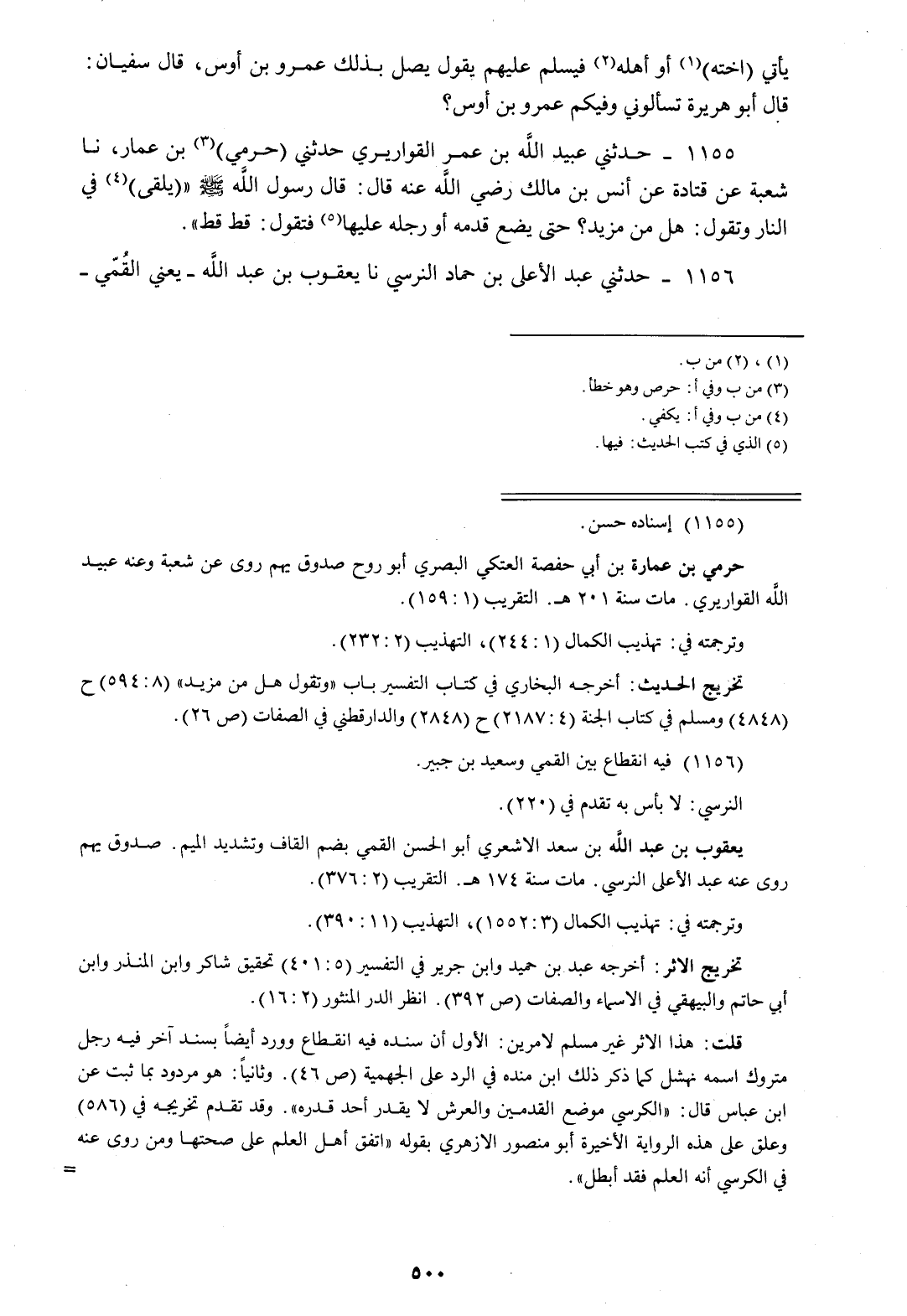 1155 - حَدَّثَنِي عُبَيْدُ اللَّهِ بْنُ عُمَرَ الْقَوَارِيرِيُّ، حَدَّثَنِي حِرْمِيُّ بْنُ عُمَارَةَ، نا شُعْبَةُ، عَنْ قَتَادَةَ، عَنْ أَنَسِ بْنِ مَالِكٍ رَضِيَ اللَّهُ عَنْهُ قَالَ: قَالَ رَسُولُ اللَّهِ صَلَّى اللهُ عَلَيْهِ وَسَلَّمَ: " يُلْقَى فِي النَّارِ وَتَقُولُ: هَلْ مِنْ مَزِيدٍ، §حَتَّى يَضَعَ قَدَمَهُ أَوْ رِجْلَهُ عَلَيْهَا، فَتَقُولُ: قَطْ قَطْ "