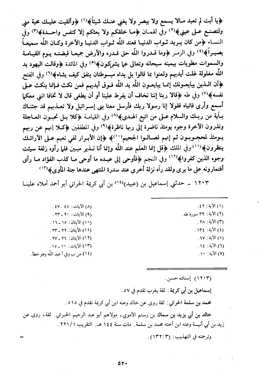 1203 - حَدَّثَنِي إِسْمَاعِيلُ بْنُ عُبَيْدِ بْنِ أَبِي كَرِيمَةَ الْحَرَّانِيُّ أَبُو أَحْمَدَ، أَمْلَاهُ عَلَيْنَا -[521]- إِمْلَاءً فِي دَارِ كَعْبٍ حَدَّثَنِي مُحَمَّدُ بْنُ سَلَمَةَ عَنْ أَبِي عَبْدِ الرَّحِيمِ خَالِدِ بْنِ أَبِي يَزِيدَ حَدَّثَنِي زَيْدُ بْنُ أَبِي أُنَيْسَةَ عَنِ الْمِنْهَالِ بْنِ عَمْرٍو عَنْ أَبِي عُبَيْدَةَ بْنِ عَبْدِ اللَّهِ عَنْ مَسْرُوقِ بْنِ الْأَجْدَعِ قَالَ: حَدَّثَنَا عَبْدُ اللَّهِ بْنُ مَسْعُودٍ عَنِ النَّبِيِّ صَلَّى اللهُ عَلَيْهِ وَسَلَّمَ قَالَ: " يَجْمَعُ اللَّهُ الْأَوَّلِينَ وَالْآخِرِينَ لِمِيقَاتِ يَوْمٍ مَعْلُومٍ قِيَامًا أَرْبَعِينَ سَنَةً شَاخِصَةً أَبْصَارُهُمْ إِلَى السَّمَاءِ يَنْتَظِرُونَ فَصْلَ الْقَضَاءِ قَالَ: فَيَنْزِلُ اللَّهُ عَزَّ وَجَلَّ فِي ظُلَلِ مِنَ الْغَمَامِ مِنَ الْعَرْشِ إِلَى الْكُرْسِيِّ ثُمَّ يُنَادِي مُنَادٍ أَيُّهَا النَّاسُ أَلَمْ تَرْضَوْا مِنْ رَبِّكُمُ الَّذِي خَلَقَكُمْ وَرَزَقَكُمْ وَأَمَرَكُمْ أَنْ تَعْبُدُوهُ وَلَا تُشْرِكُوا بِهِ شَيْئًا أَنْ يُوَلِّيَ كُلَّ إِنْسَانٍ مِنْكُمْ مَا كَانَ يَتَوَلَّى وَيَعْبُدُ فِي الدُّنْيَا أَلَيْسَ ذَلِكَ عَدْلًا مِنْ رَبِّكُمْ؟ قَالُوا: بَلَى. قَالَ: فَلْيَنْطَلِقْ كُلُّ قَوْمٍ إِلَى مَا كَانُوا يَعْبُدُونَ وَيَتَوَلَّوْنَ فِي الدُّنْيَا قَالَ: فَيَنْطَلِقُونَ وَيُمَثَّلُ لَهُمْ أَشْبَاهُ مَا كَانُوا يَعْبُدُونَ فَمِنْهُمْ مَنْ يَنْطَلِقُ إِلَى الشَّمْسِ وَمِنْهُمْ مَنْ يَنْطَلِقُ إِلَى الْقَمَرِ وَإِلَى الْأَوْثَانِ وَالْحِجَارَةِ وَأَشْبَاهِ مَا كَانُوا يَعْبُدُونَ قَالَ: وَيُمَثَّلُ لِمَنْ كَانَ يَعْبُدُ عِيسَى شَيْطَانُ عِيسَى وَيُمَثَّلُ لِمَنْ كَانَ يَعْبُدُ عُزَيْرًا شَيْطَانُ عُزَيْرٍ وَيَبْقَى مُحَمَّدٌ صَلَّى اللهُ عَلَيْهِ وَسَلَّمَ وَأُمَّتُهُ قَالَ: فَيَتَمَثَّلُ الرَّبُّ جَلَّ وَعَزَّ فَيَأْتِيهِمْ فَيَقُولُ لَهُمْ: مَا لَكُمْ لَا تَنْطَلِقُونَ كَمَا انْطَلَقَ النَّاسُ؟ فَيَقُولُونَ: إِنَّ لَنَا إِلَهًا. فَيَقُولُ: وَهَلْ تَعْرِفُونَهُ إِنْ رَأَيْتُمُوهُ؟ فَيَقُولُونَ بَيْنَنَا وَبَيْنَهُ عَلَامَةٌ إِذَا رَأَيْنَاهُ عَرَفْنَاهَا. فَيَقُولُ: مَا هِيَ؟ يَقُولُونَ يَكْشِفُ عَنْ سَاقِهِ. قَالَ: §فَعِنْدَ ذَلِكَ يَكْشِفُ -[522]- اللَّهُ عَنْ سَاقِهِ فَيَخِرُّ كُلُّ مَنْ كَانَ بِظَهْرِهِ طَبَقٌ وَيَبْقَى قَوْمٌ ظُهُورُهُمْ كَصَيَاصِي الْبَقَرِ يُدْعَوْنَ إِلَى السُّجُودِ فَلَا يَسْتَطِيعُونَ وَقَدْ كَانُوا يُدْعَوْنَ إِلَى السُّجُودِ وَهُمْ سَالِمُونَ ثُمَّ يَقُولُ ارْفَعُوا رُءُوسَكُمْ قَالَ: فَيَرْفَعُونَ رُءُوسَهُمْ فَيُعْطِيهِمْ نُورَهُمْ عَلَى قَدْرِ أَعْمَالِهِمْ فَمِنْهُمْ مَنْ يُعْطَى نُورَهُ مِثْلَ الْجَبَلِ الْعَظِيمِ يَسْعَى بَيْنَ يَدَيْهِ وَمِنْهُمْ مَنْ يُعْطَى نُورَهُ أَصْغَرَ مِنْ ذَلِكَ وَمِنْهُمْ مَنْ يُعْطَى نُورَهُ مِثْلَ النَّخْلَةِ بِيَمِينِهِ وَمِنْهُمْ مَنْ يُعْطَى نُورَهُ أَصْغَرَ مِنْ ذَلِكَ حَتَّى يَكُونَ آخِرُهُمْ رَجُلًا يُعْطَى نُورَهُ عَلَى إِبْهَامِ قَدَمِهِ فَيُضِيءُ مَرَّةً وَيُطْفِئُ مَرَّةً فَإِذَا أَضَاءَ قَدَّمَ قَدَمَهُ فَمَشَى وَإِذَا أُطْفِئَ قَامَ قَالَ: وَالرَّبُّ جَلَّ وَعَزَّ أَمَامَهُمْ حَتَّى يَمُرَّ فِي النَّارِ، وَيَبْقَى أَثَرُهُ كَحَدِّ السَّيْفِ دَحْضٌ مَزِلَّةٍ قَالَ: وَيَقُولُ مُرُّوا فَيَمُرُّونَ عَلَى قَدْرِ ذُنُوبِهِمْ مِنْهُمْ مَنْ يَمُرُّ كَطَرْفَةِ الْعَيْنِ وَمِنْهُمْ مَنْ يَمُرُّ كَالْبَرْقِ وَمِنْهُمْ مَنْ يَمُرُّ كَالسَّحَابِ وَمِنْهُمْ مَنْ يَمُرُّ كَالرِّيحِ وَمِنْهُمْ مَنْ يَمُرُّ كَانْقِضَاضِ الْكَوَاكِبِ وَمِنْهُمْ مَنْ يَمُرُّ كَشَدِّ الْفَرَسِ وَمِنْهُمْ 