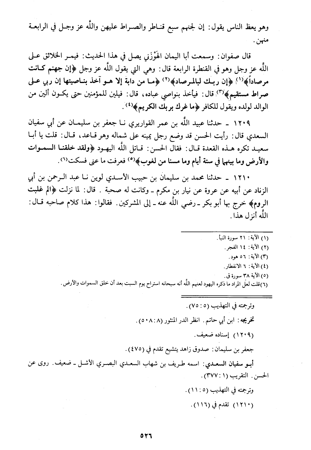 1209 - حَدَّثَنَا عُبَيْدُ اللَّهِ بْنُ عُمَرَ الْقَوَارِيرِيُّ، نا جَعْفَرُ بْنُ سُلَيْمَانَ، عَنْ أَبِي سُفْيَانَ السَّعْدِيِّ، قَالَ: رَأَيْتُ الْحَسَنَ قَدْ وَضَعَ رِجْلَ يَمِينِهِ عَلَى شِمَالِهِ وَهُوَ قَاعِدٌ قَالَ: قُلْتُ يَا أَبَا سَعِيدٍ تُكْرَهُ هَذِهِ الْقَعْدَةَ قَالَ: فَقَالَ الْحَسَنُ «§قَاتَلَ اللَّهُ الْيَهُودَ» {وَلَقَدْ خَلَقْنَا السَّمَاوَاتِ وَالْأَرْضَ وَمَا بَيْنَهُمَا فِي سِتَّةِ أَيَّامٍ وَمَا مَسَّنَا مِنْ لُغُوبٍ} [ق: 38] فَعَرَفْتُ مَا عَنَى فَسَكَتُّ